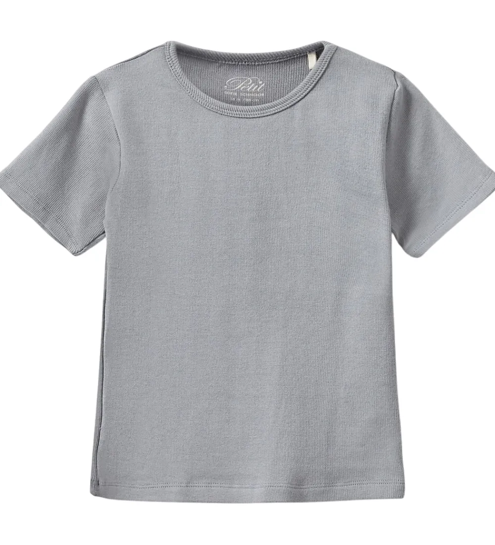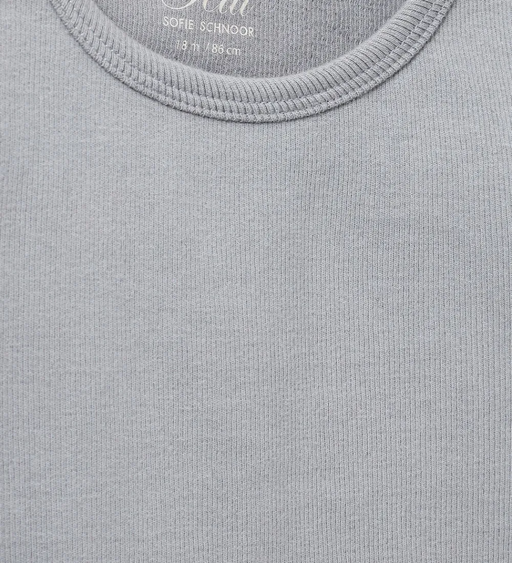 Skøn Sofie Schnoor t-shirt i gråblå med ribstruktur. T-shirten har en rund halsudskæring med en smal ribkant og trykknapper ved venstre skulder. T-shirten er fremstillet i en meget blød kvalitet.