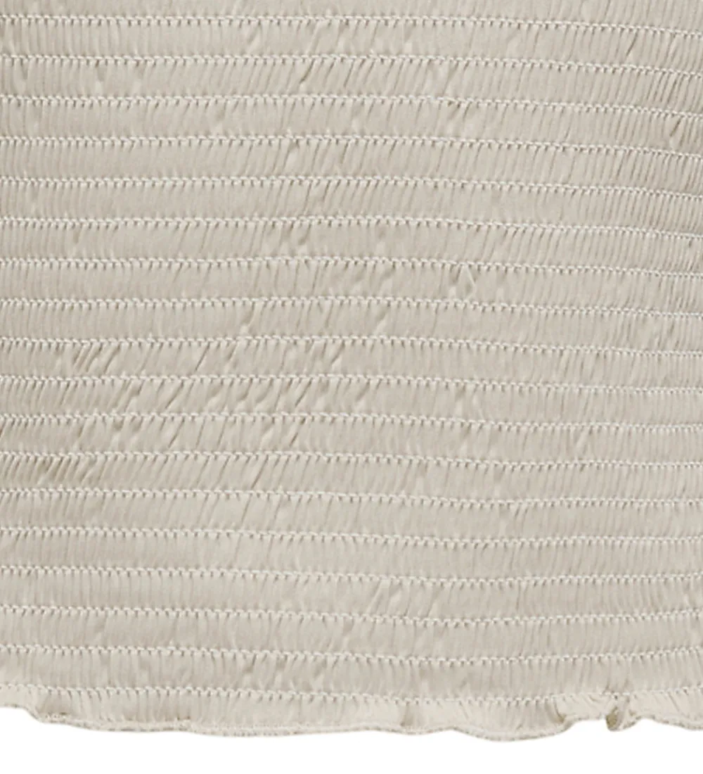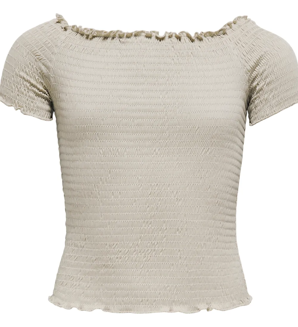 Elegant Kids Only t-shirt i sandfarvet med smock-struktur. T-shirten har et off-shoulder design med korte ærmer. Den er lavet i en meget elastisk kvalitet med en tætsiddende pasform.
