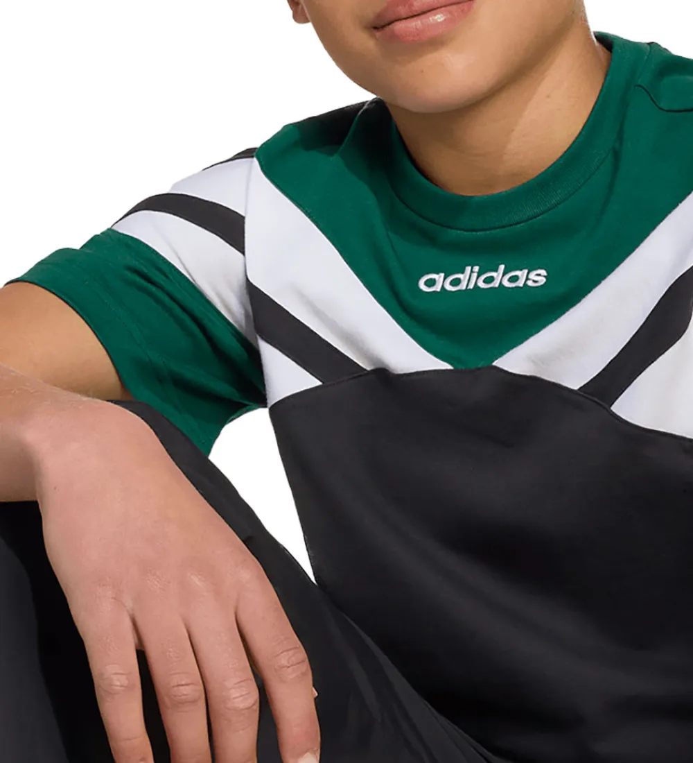 Stilfuld adidas Originals t-shirt med en iøjnefaldende designstruktur. T-shirten har en overdel i grøn, der elegant går ned i sort på forsiden. Den er dekoreret med tre hvide striber i et vinkelformet mønster på brystet. adidas Originals logoet er trykt centralt på forsiden i hvidt.