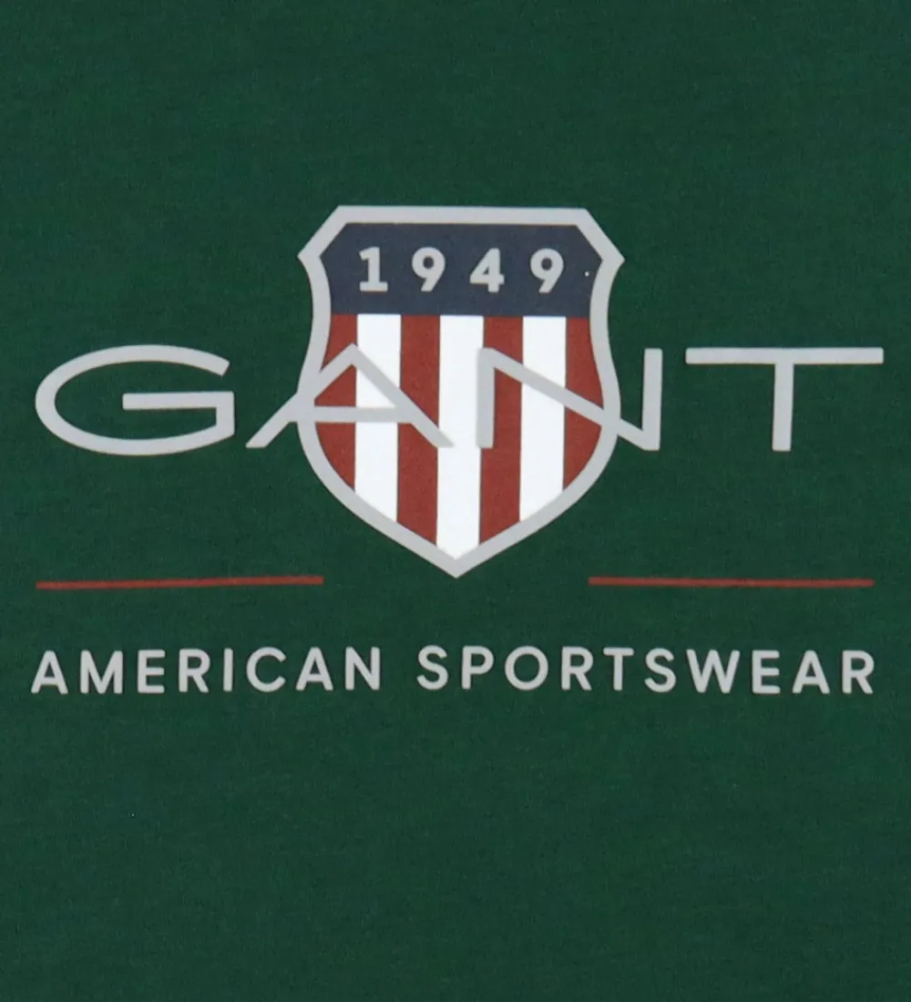 T-shirten prydes af et markant GANT-logo på brystet, som inkluderer et skjold med “1949” og teksten “American Sportswear”. Det simple design tilfører et tidløst udtryk til t-shirten, der har en klassisk rund halsudskæring med en smal ribkant.