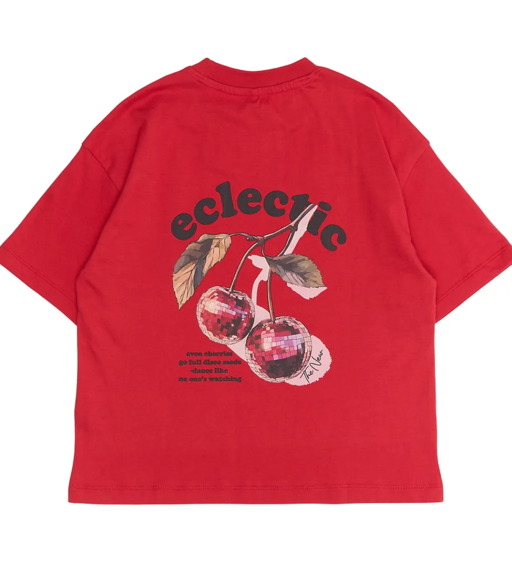 Elegant The New t-shirt i en dyb, rød farve. T-shirten har et stilfuldt kirsebær-print på brystet og ryggen, der giver et unikt udtryk. The New t-shirten har en rund halsudskæring med en smal ribkant samt korte ærmer, som sikrer en behagelig struktur.