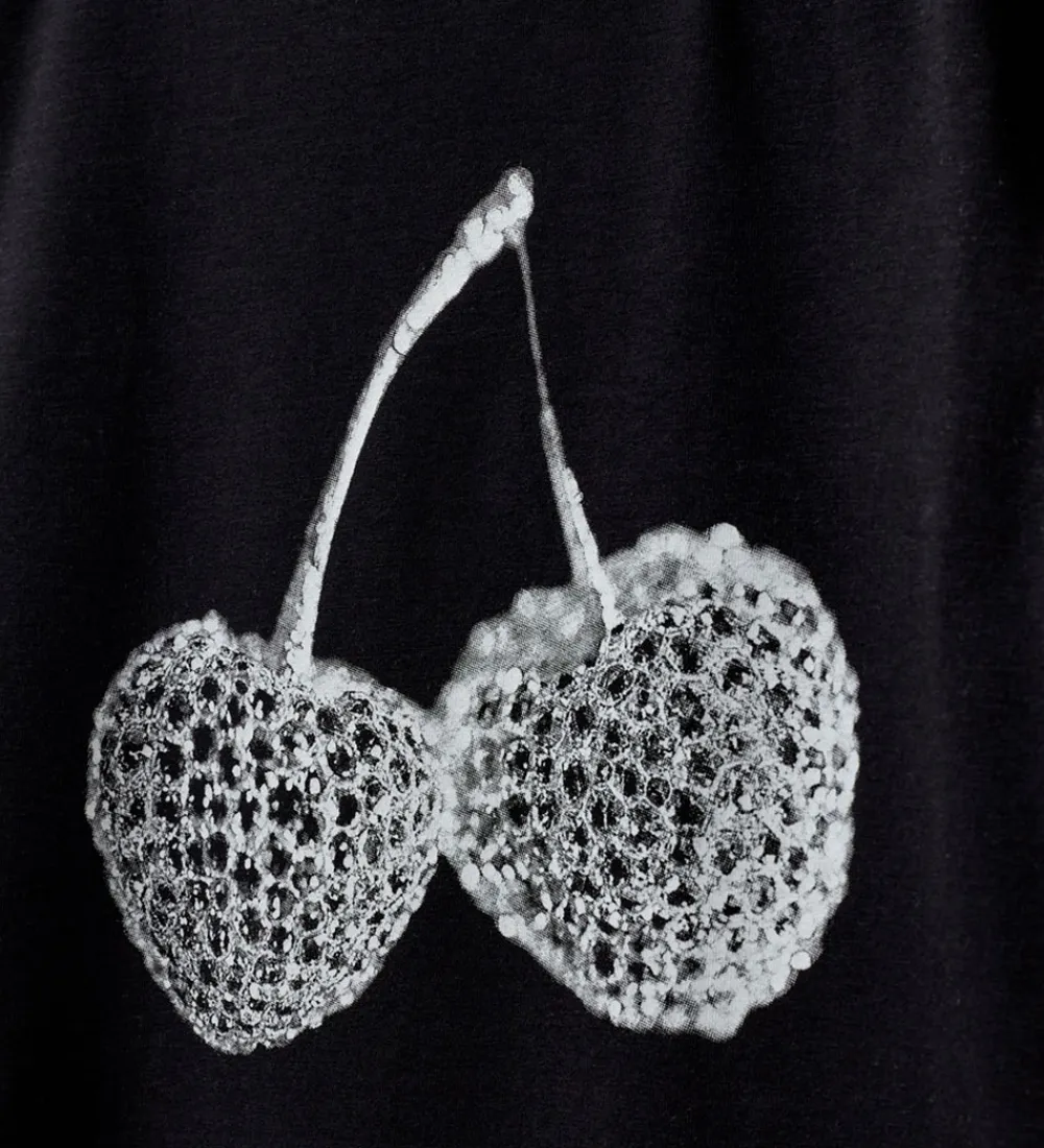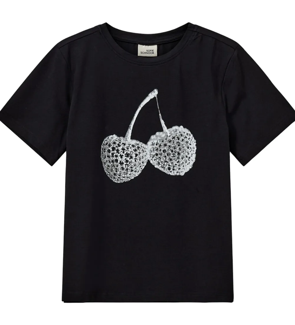 Elegant Sofie Schnoor t-shirt i en dyb sort farve. T-shirten prydes af et markant print af to kirsebær i grå nuancer, hvilket giver et iøjnefaldende udtryk. Sofie Schnoor t-shirten har en klassisk rund halsudskæring med en smal ribkant, der sikrer en enkel stil.