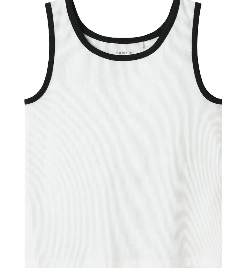 Behagelig Name It tanktop i en hvid nuance med sorte kanter og ribstruktur. Tanktoppen er ærmeløs, hvilket giver en let og luftig følelse. Et stilrent valg fra Name It, der nemt passer ind i garderoben.