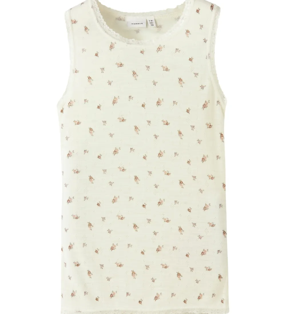Elegant Name It undertrøje i råhvid med et fint, småblomstret mønster. Undertrøjen har en blød struktur og fine kanter ved halsudskæringen. Name It tilbyder her et design med et subtilt print, der tilføjer et stilfuldt touch. Undertrøjen er fremstillet af lækkert merinould.