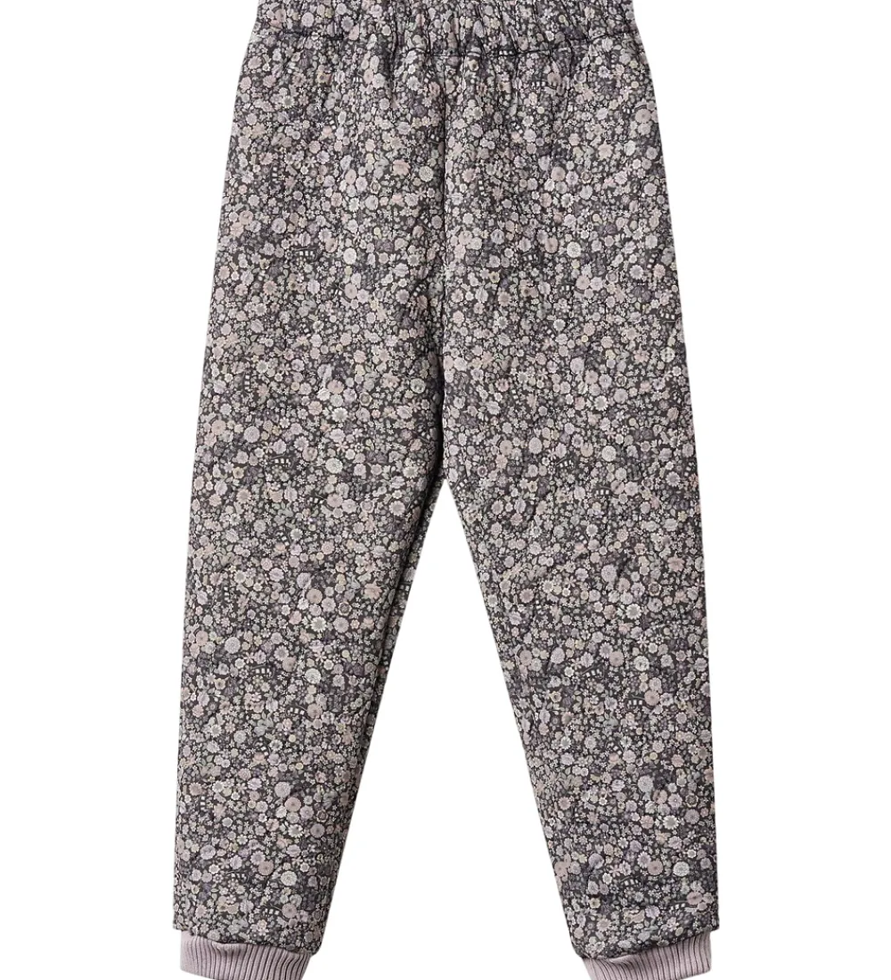 Flotte Wheat termobukser i mørk koksgrå med et alloverblomsterprint i støvede lilla, rosa og grønne nuancer samt ribkanter i støvet lilla. Termobukserne har en bølgende, quiltet struktur.