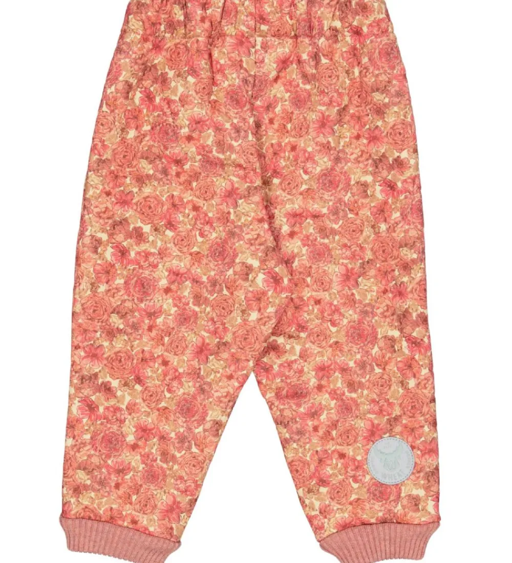 Skønne Wheat termobukser med et alloverprint af blomster i forskellige rosa nuancer på en beige baggrund. Termobukserne har en bølgende, quiltet struktur.