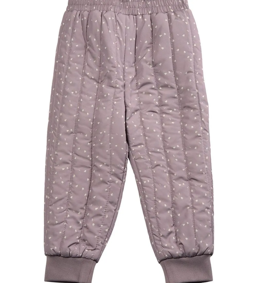 Fine Petit by Sofie Schnoor termobukser i lys lilla med et alloverblomsterprint i lyse toner. Termobukserne er med en quiltet struktur.