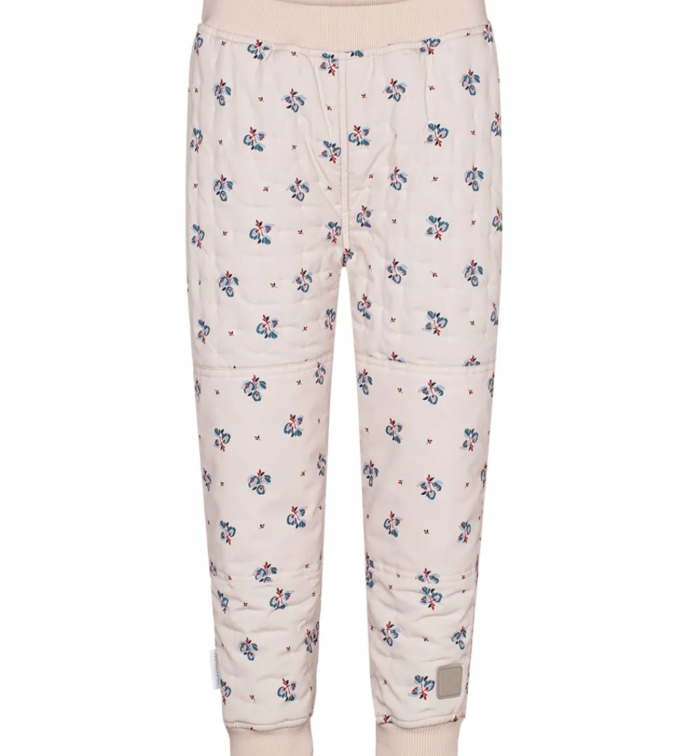 Skønne MarMar termobukser i beige med et rosa skær og et flot alloverblomsterprint med blå og røde nuancer. Termobukserne har en quiltet struktur af små, indprægede prikker.