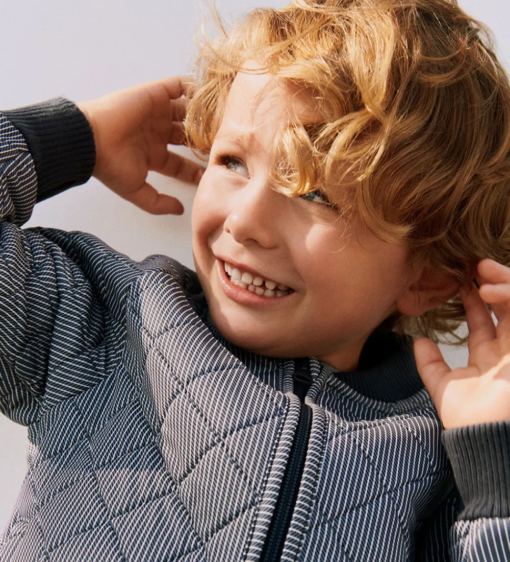 Lækker Wheat termojakke i navyblå med fine, hvide striber og en quiltet struktur.
