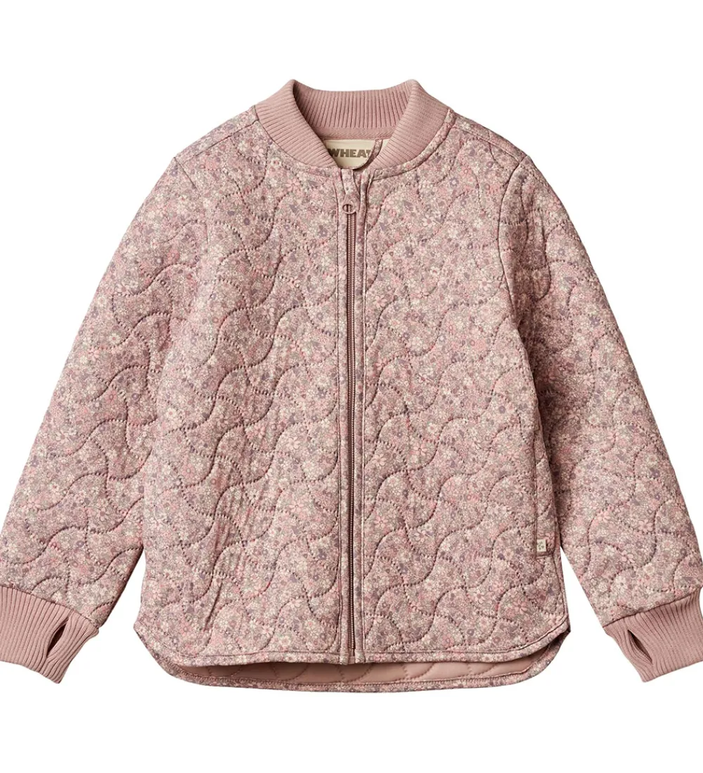 Fin Wheat termojakke i rosa med et alloverblomsterprint og en bølgende, quiltet struktur.