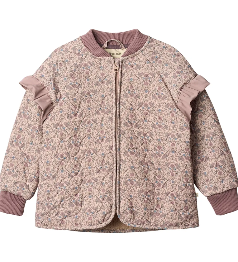 Fin Wheat termojakke i lys rosa med et alloverblomsterprint i støvede lilla, blå og grønne nuancer samt ribkanter og flæseskuldre i støvet lilla. Termojakken har en bølgende, quiltet struktur.