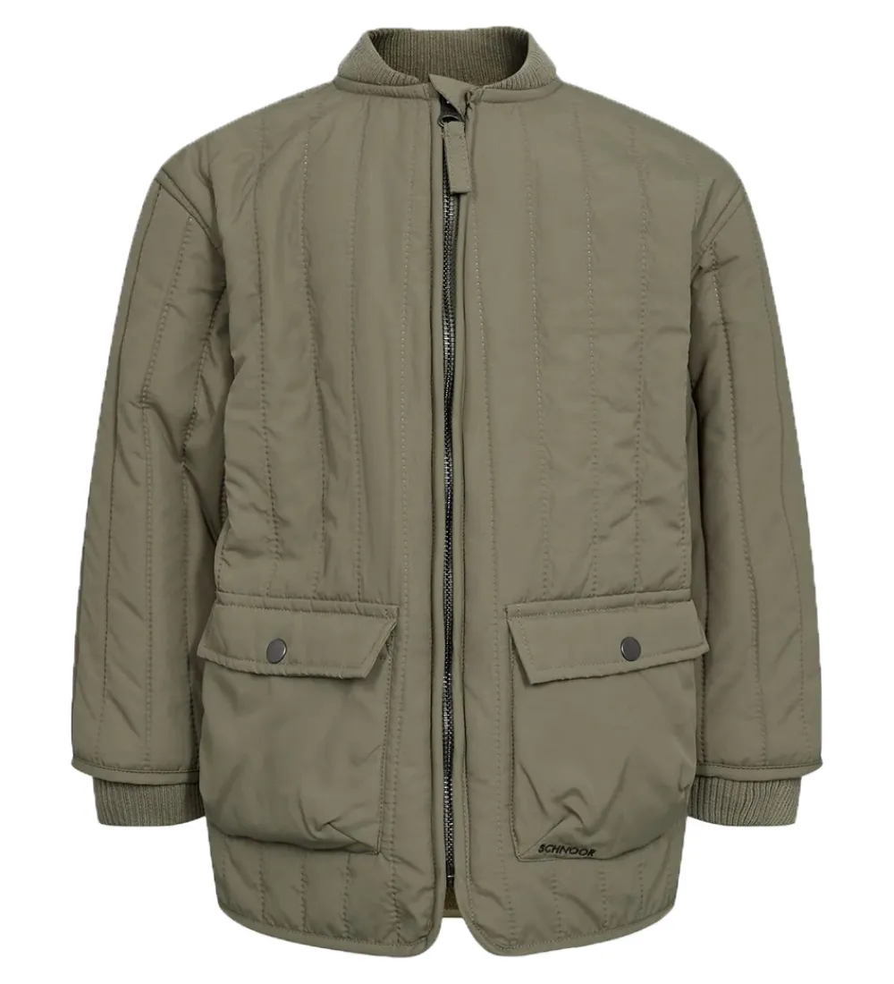 Skøn Petit by Sofie Schnoor termojakke i armygrøn med en broderet tiger og teksten “MAGIC” på ryggen. Termojakken er med en quiltet struktur.