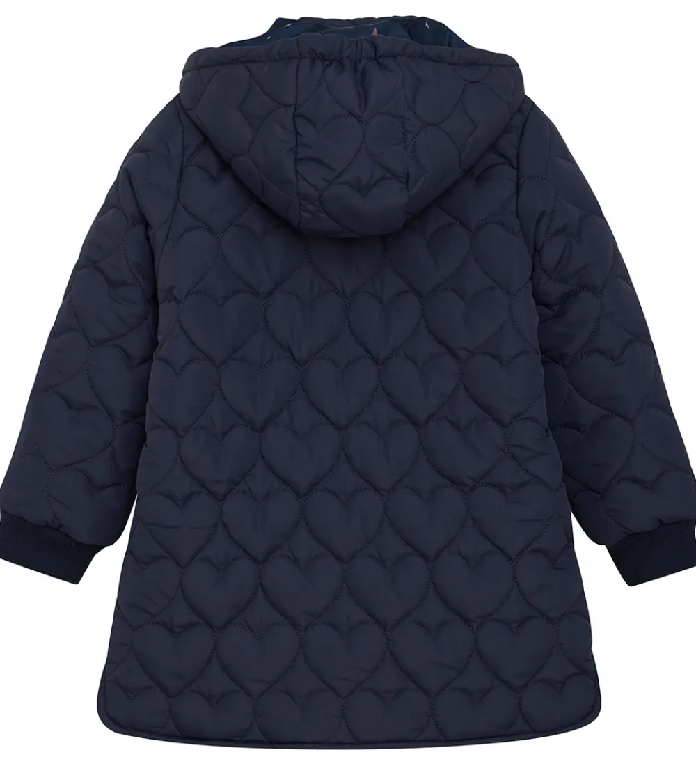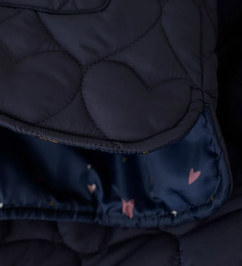 Praktisk Minymo termojakke i navyblå med hjerteformet quiltet struktur.