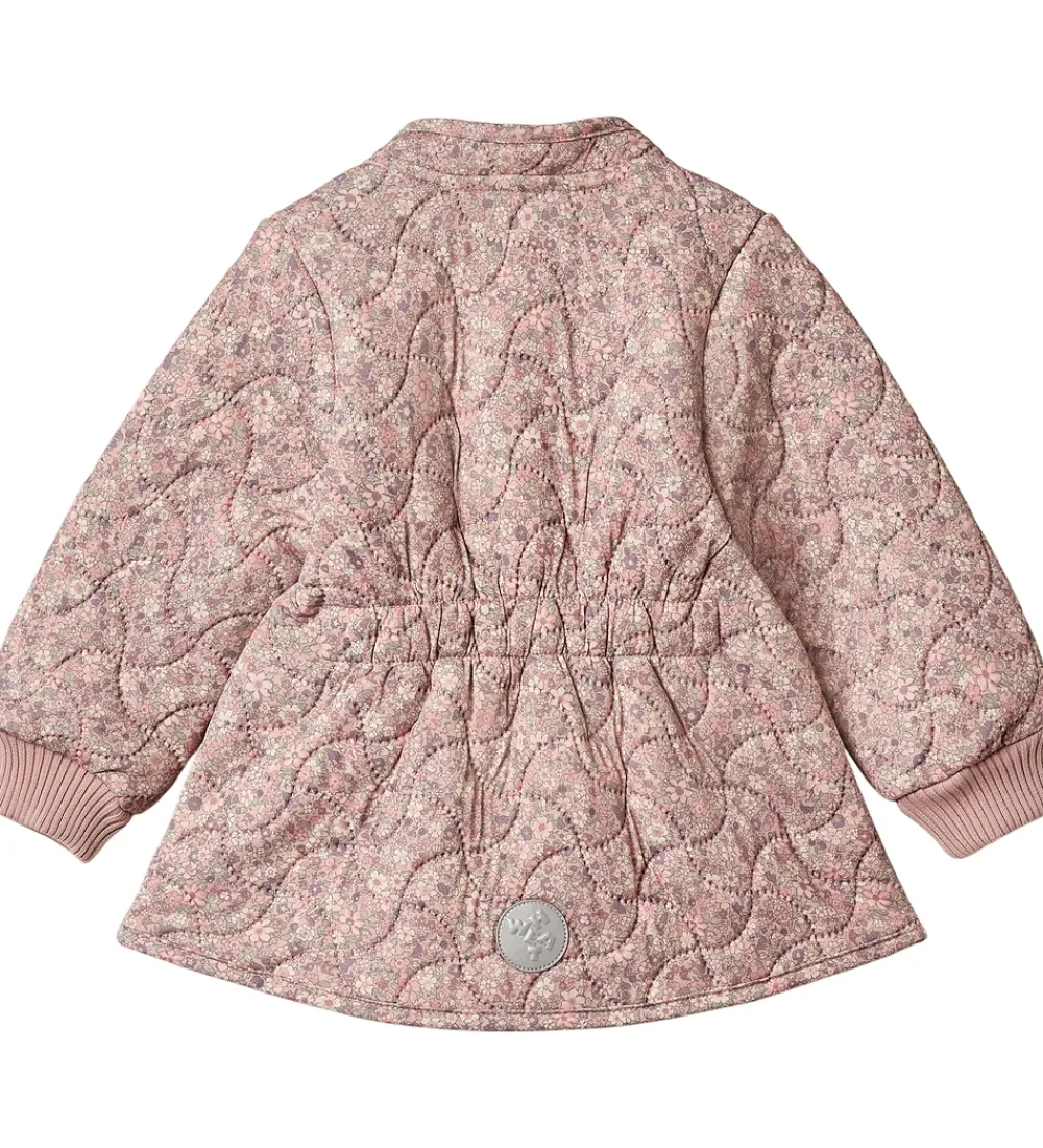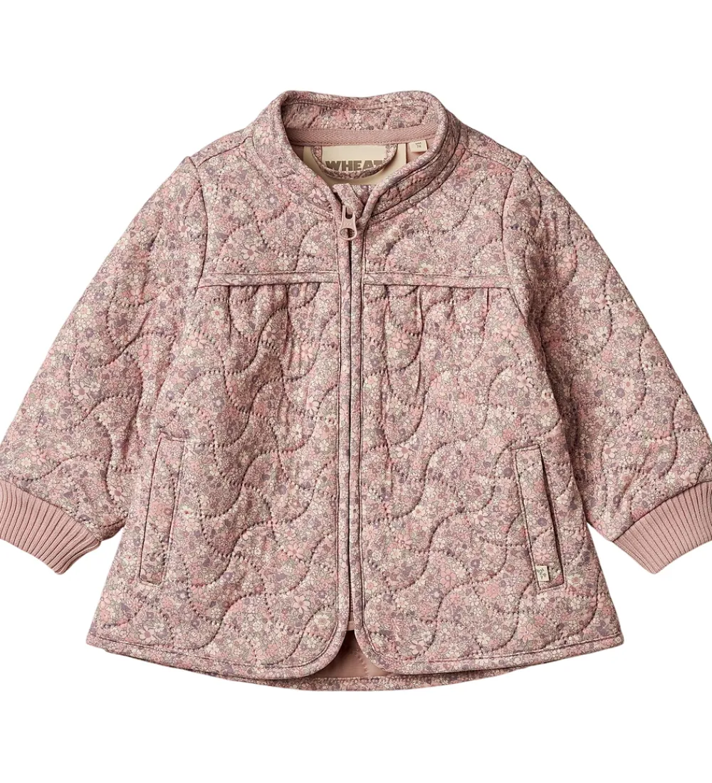 Lækker Wheat termojakke i rosa med et alloverblomsterprint i lyseblå, grønne, hvide og rosa nuancer. Termojakken har en bølgende, quiltet struktur.