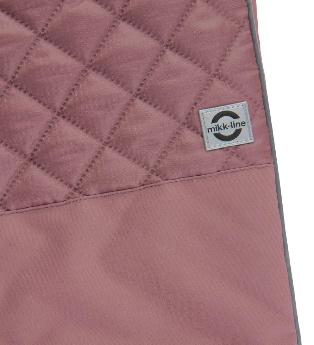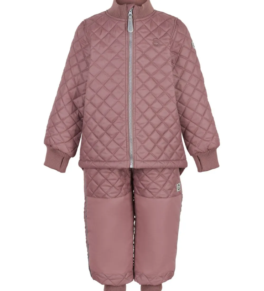 Yndigt Mikk-Line termotøj bestående af en termojakke og et par termobukser i mørkerosa med en quiltet struktur.