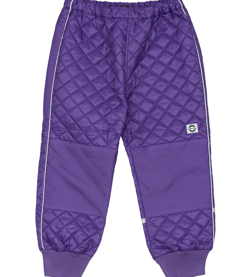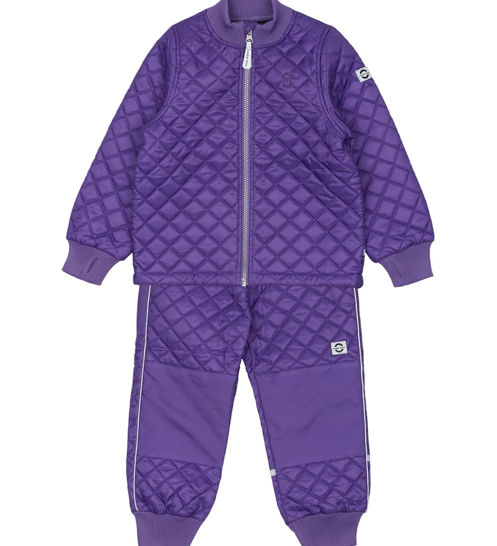 Fint Mikk-Line termotøj bestående af en termojakke og et par termobukser i lilla med en quiltet struktur.