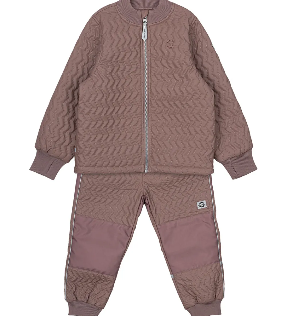 Lækkert Mikk-Line termotøj bestående af en termojakke og et par termobukser i støvet lilla. Termotøjet har en struktur af striber med indprægede, små prikker.