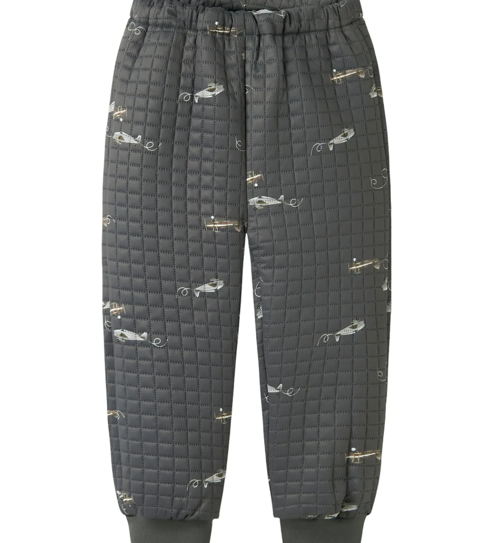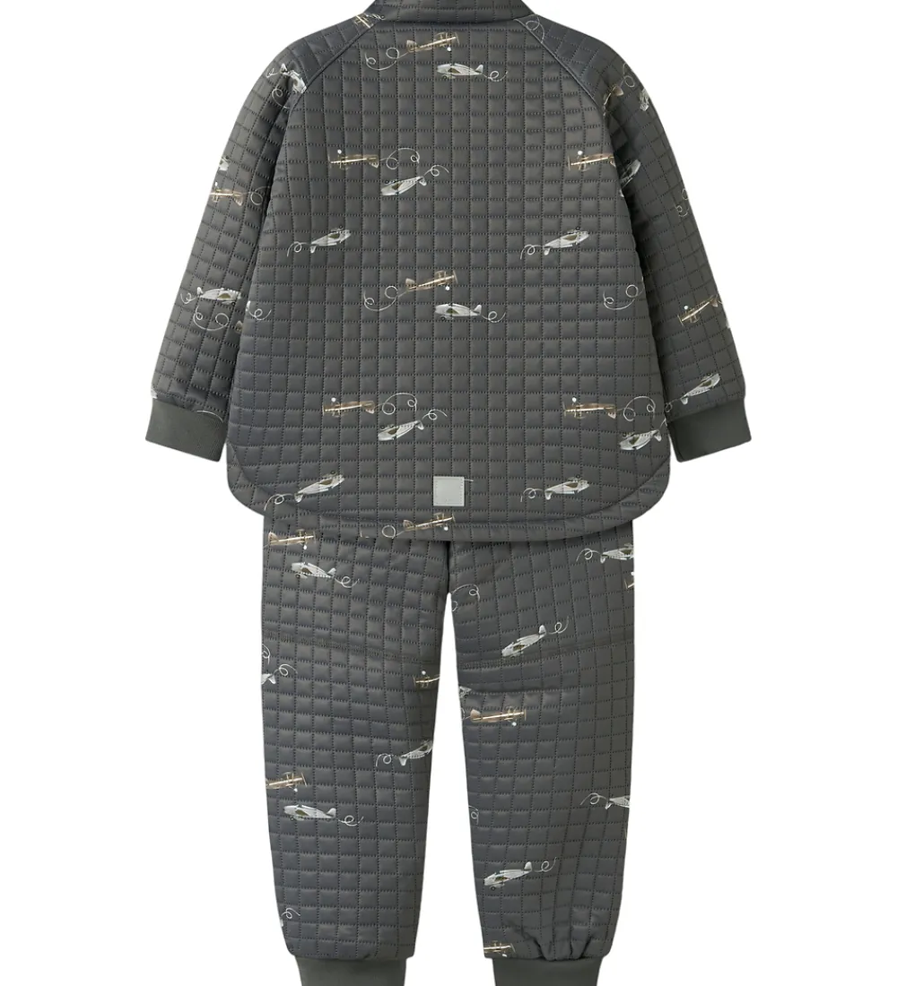 Sejt Name It termotøj i mørk koksgrå med print af flyvemaskiner samt en quiltet struktur i et ternet mønster.