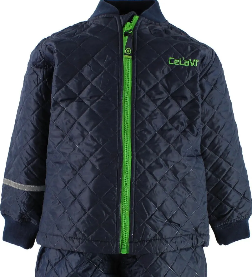Termotøj fra CelaVi her, er marineblå med grøn lynlås og detaljer.