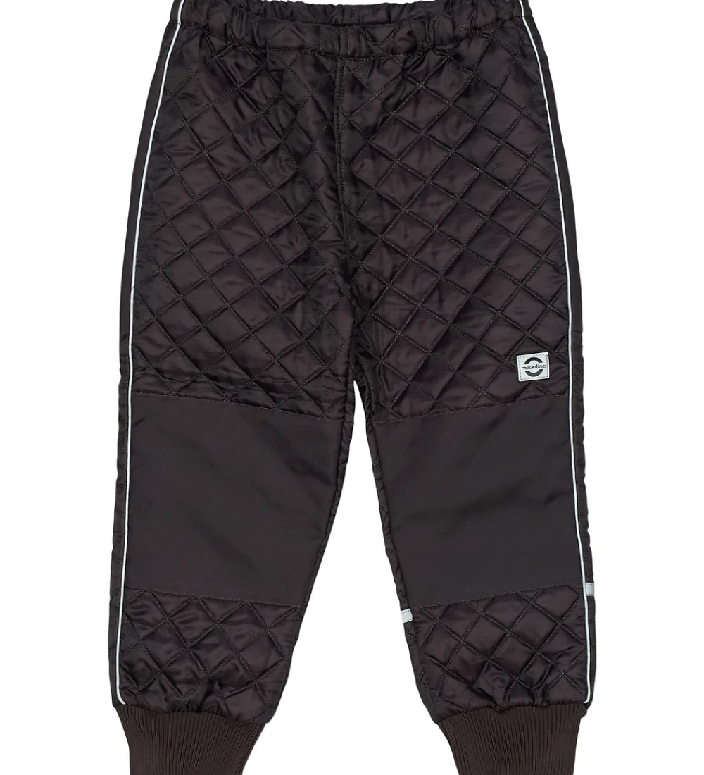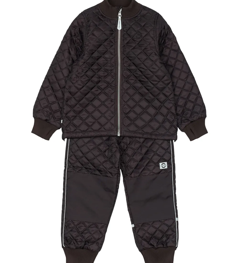 Fint Mikk-Line termotøj bestående af en termojakke og et par termobukser i mørkebrun med et lilla skær og en quiltet struktur.