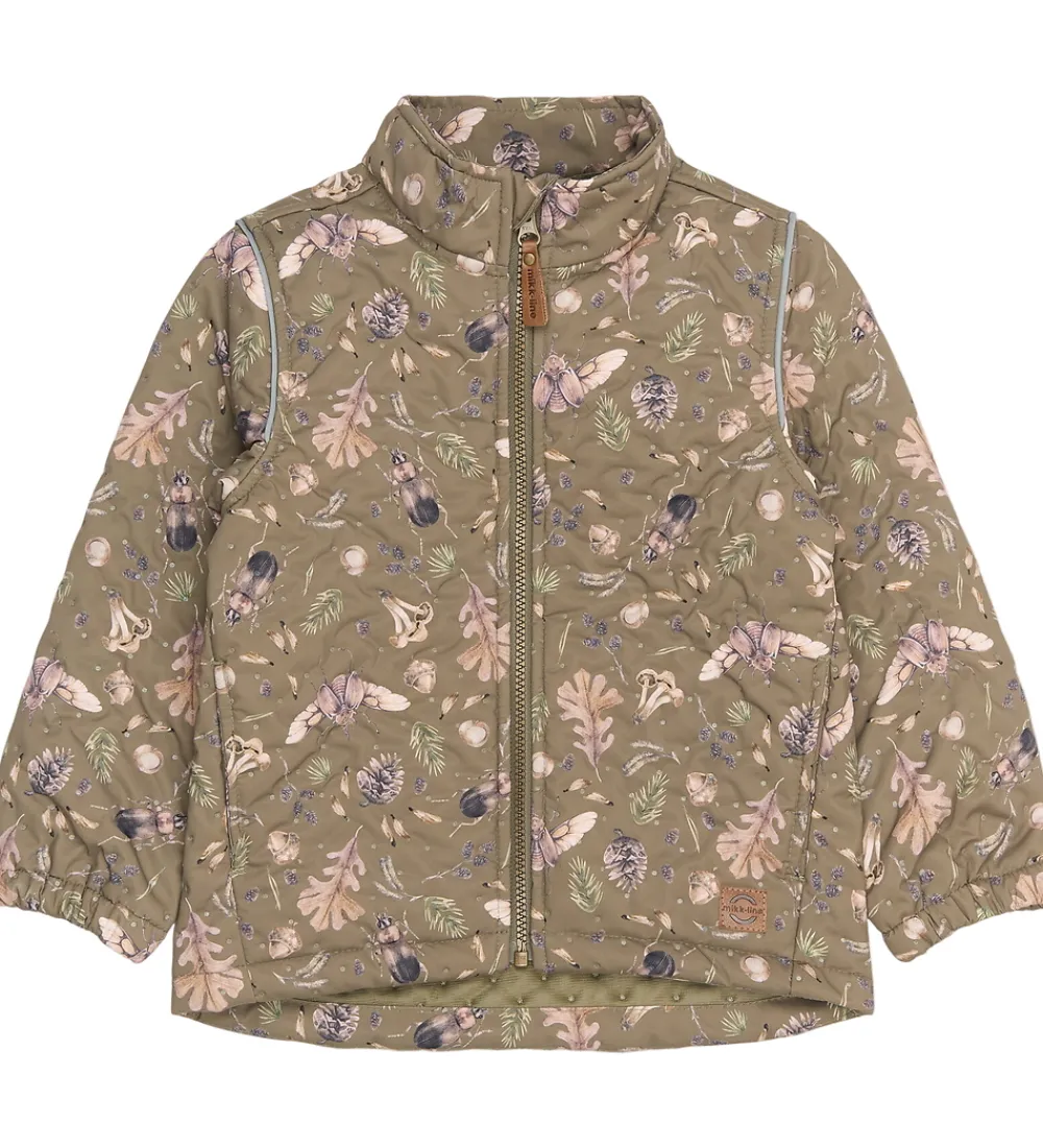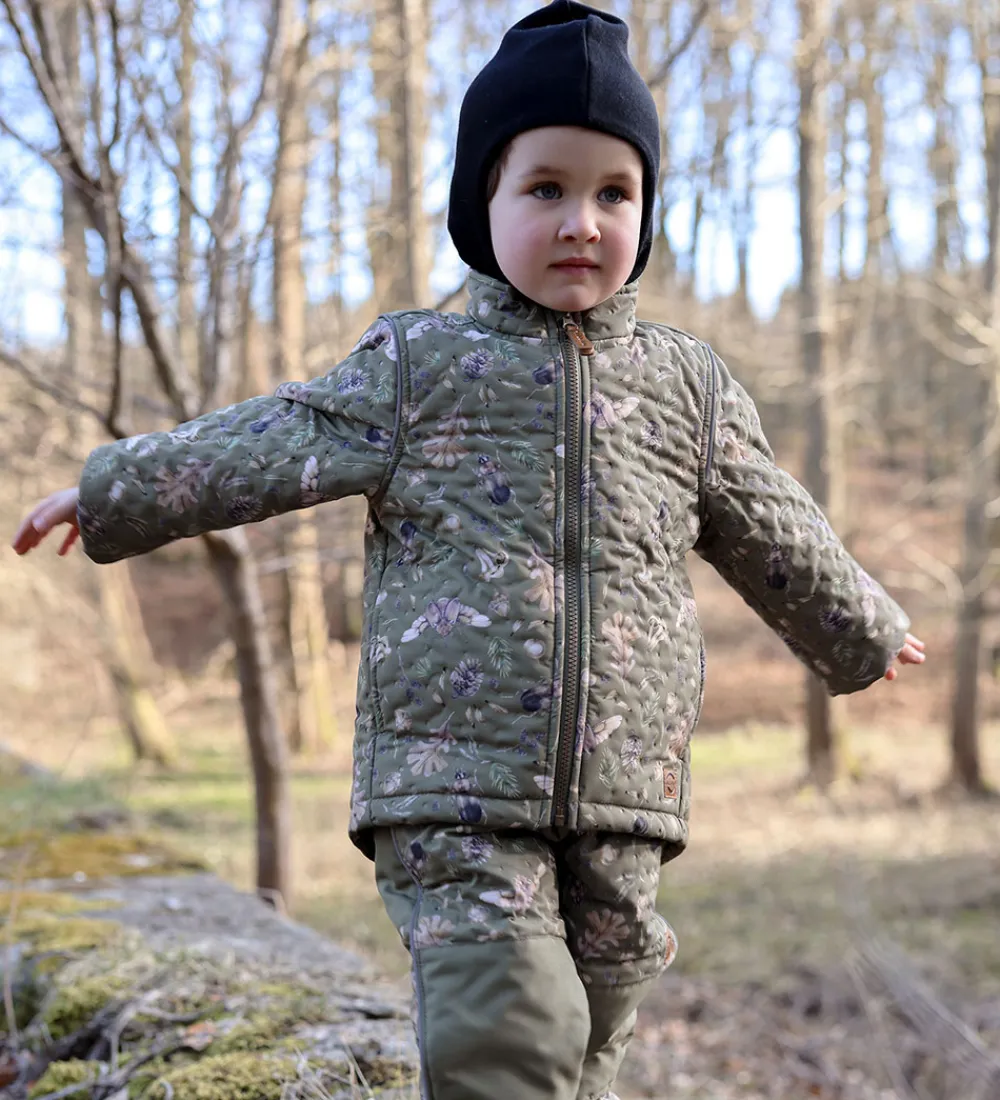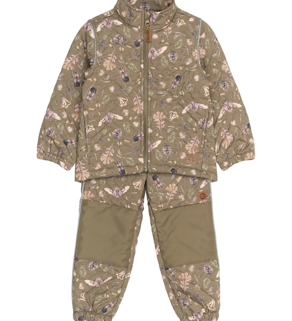 Skønt Mikk-Line termotøj bestående af en termojakke og et par termobukser i grøn med et alloverprint af insekter, blanter og blade i brune nuancer med et indpræget prikmønster, der laver en flot struktur.