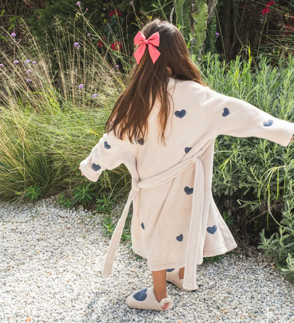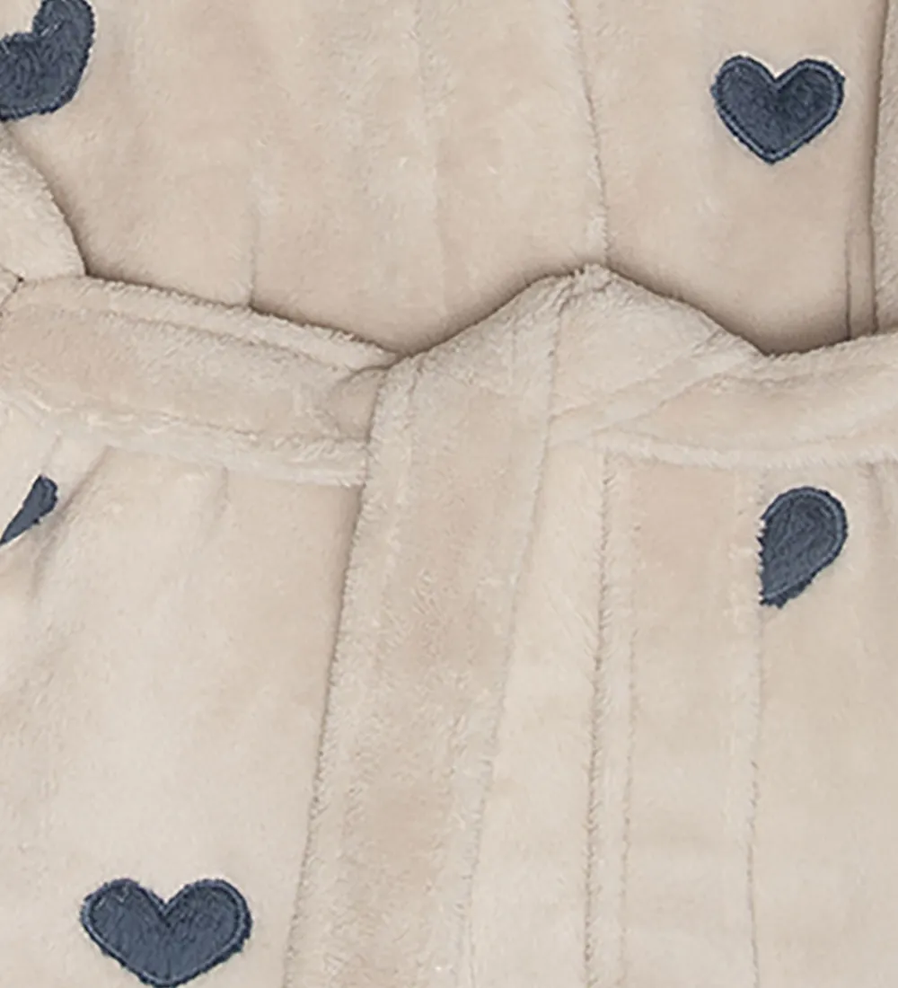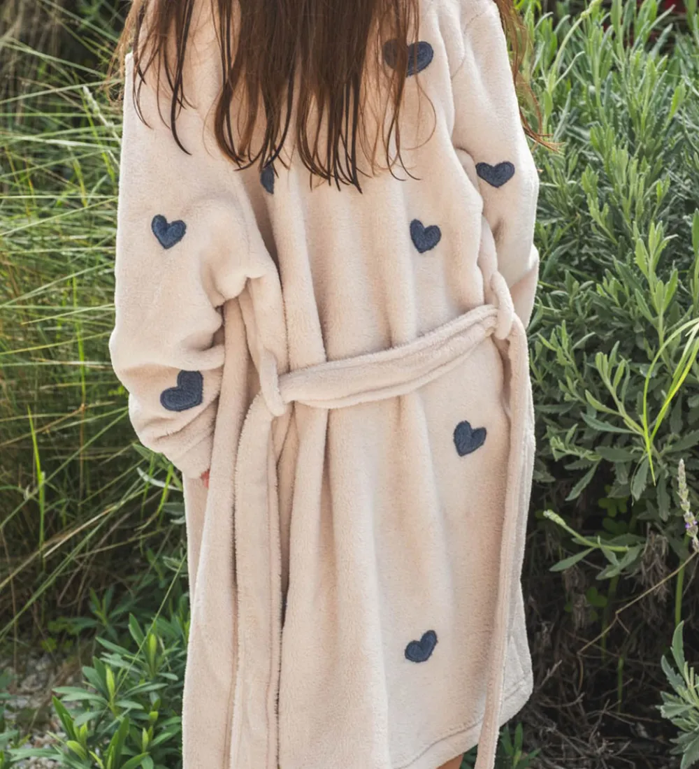 Blød That’s Mine badekåbe i lys beige med fine hjerteapplikationer i mørkeblå over hele kåben.