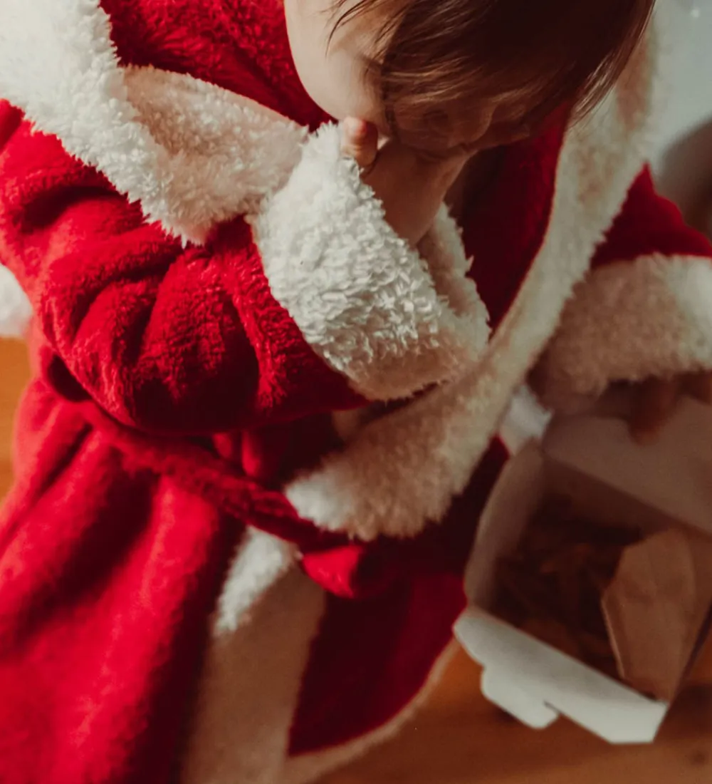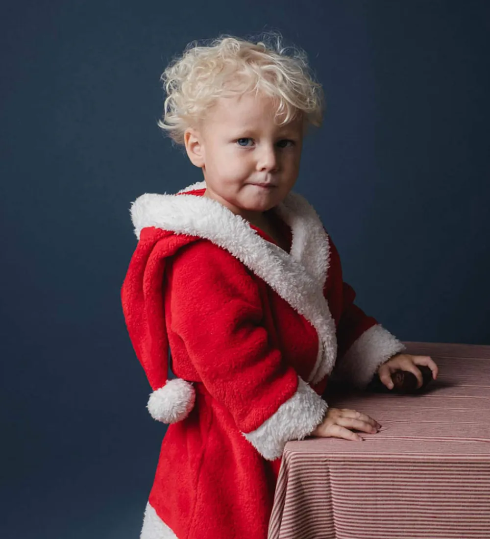 Thats Mine badekåben har lange ærmer og en rummelig hætte, som er formet som en nissehue. Den lukkes foran med et bindebånd, der sikrer en tilpasset pasform. På ryggen er der et fint “Merry Christmas” broderi.