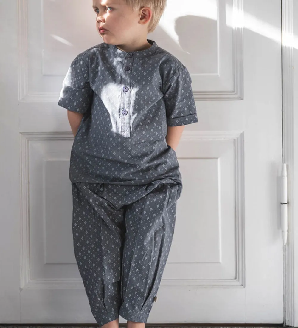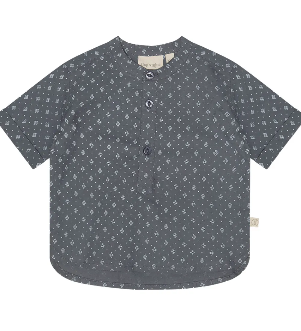 Lækker Thats Mine skjorte med korte ærmer i en blå nuance med et fint allovermønster af små diamantskaber. Skjorten har knaplukning fortil og er ideel til leg eller afslapning.