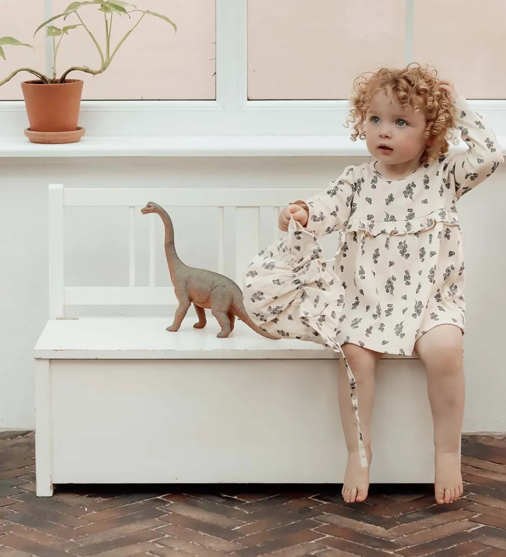 That’s Mine tunikaen har lange ærmer og en rund halsudskæring. På venstre skulder er der en trykknap, så der let kan tages af og på. I livet er der en lille syning samt en flæse, hvor kjolen bliver til skørt, som går ud i fine folder.