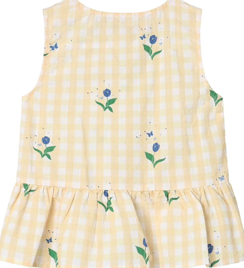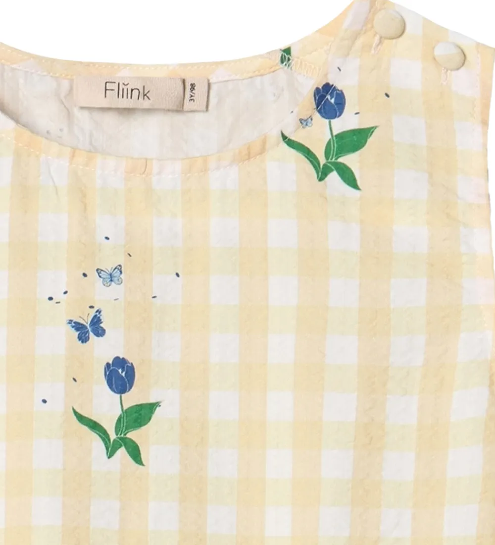 Charmerende Fliink top i et fint gult og hvidt ternet mønster. Toppen er prydet med smukke blå blomster og små sommerfugle, der giver et frisk og livligt udtryk.