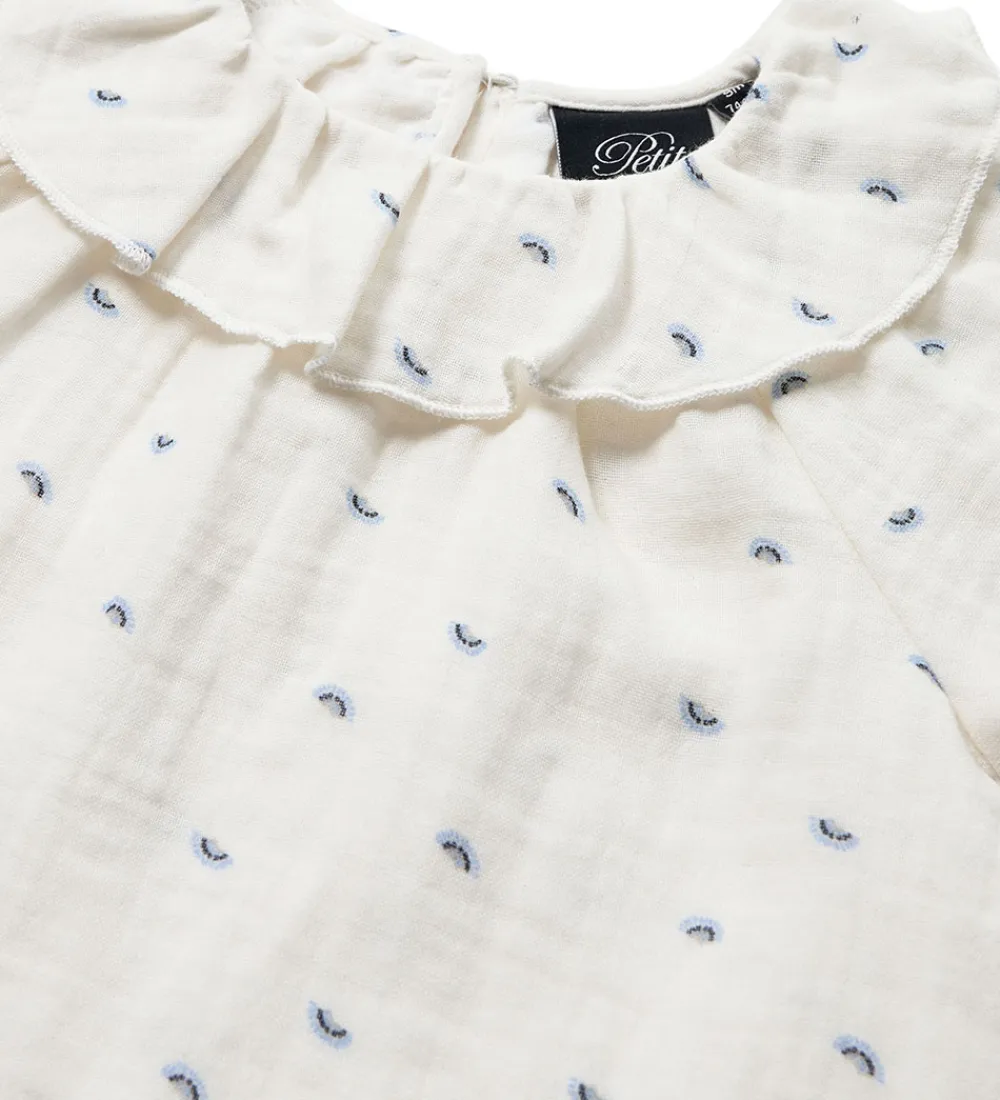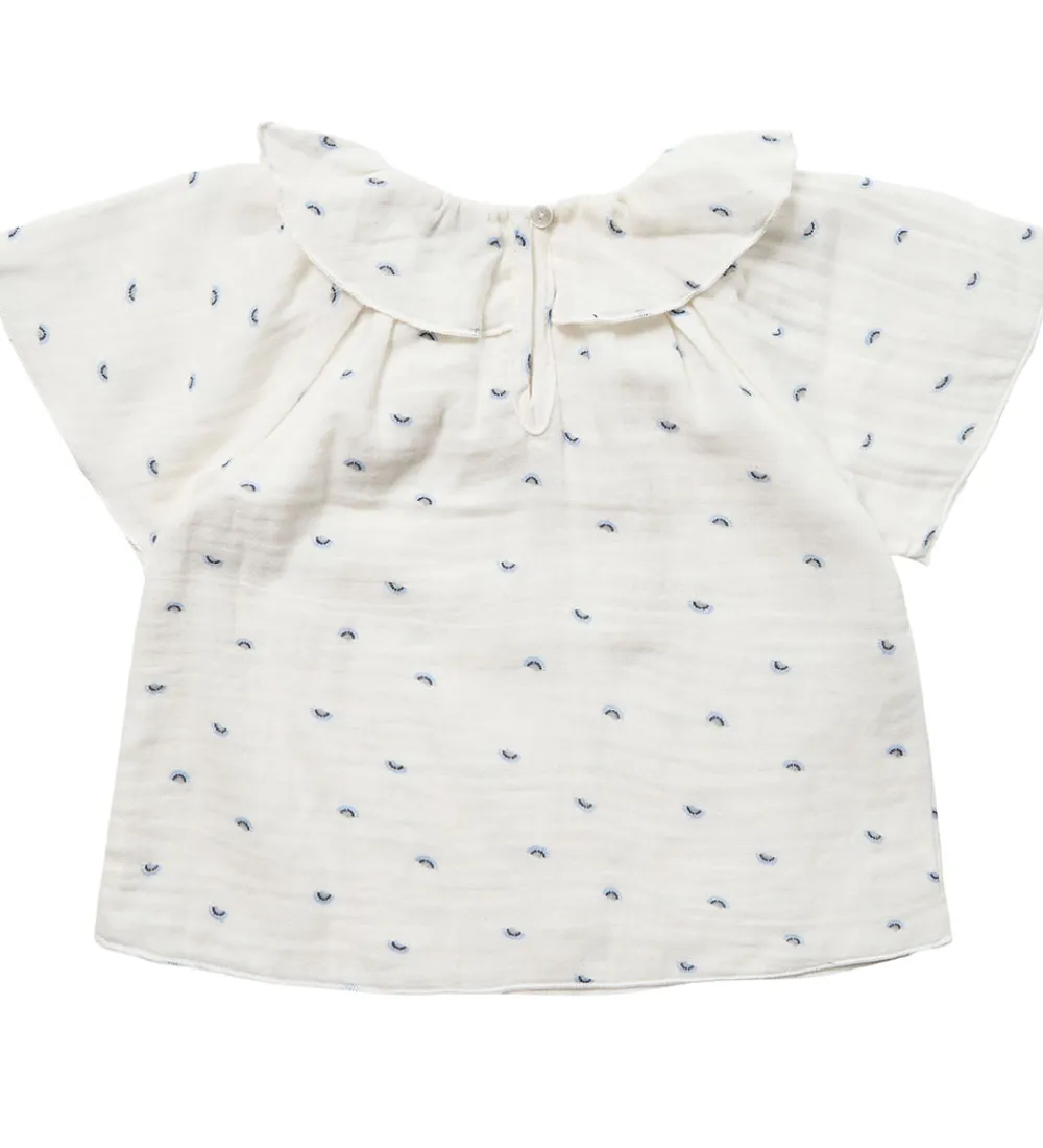 Fin Sofie Schnoor top i hvid musselin, med et allover print af små buer i blå og navy.
