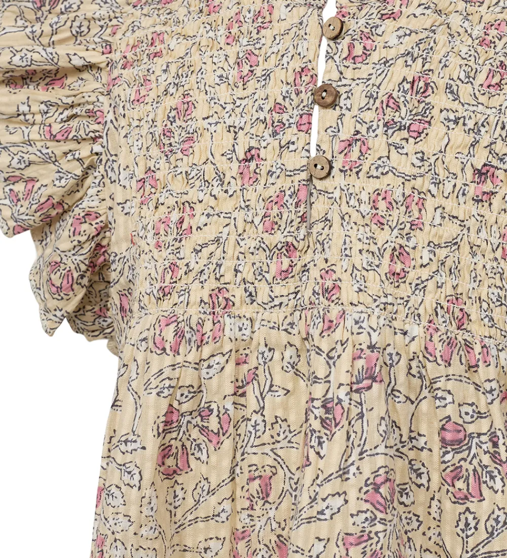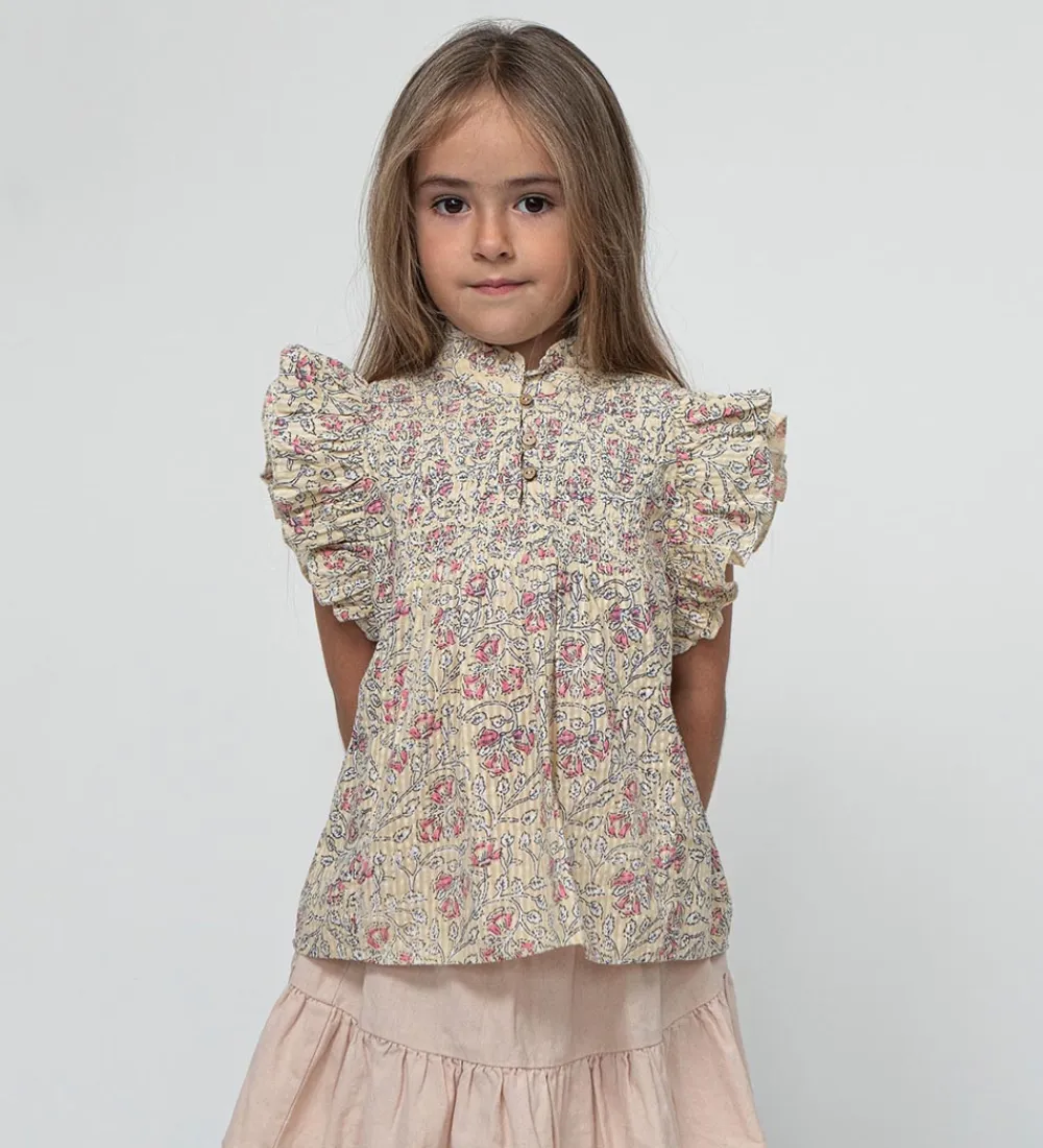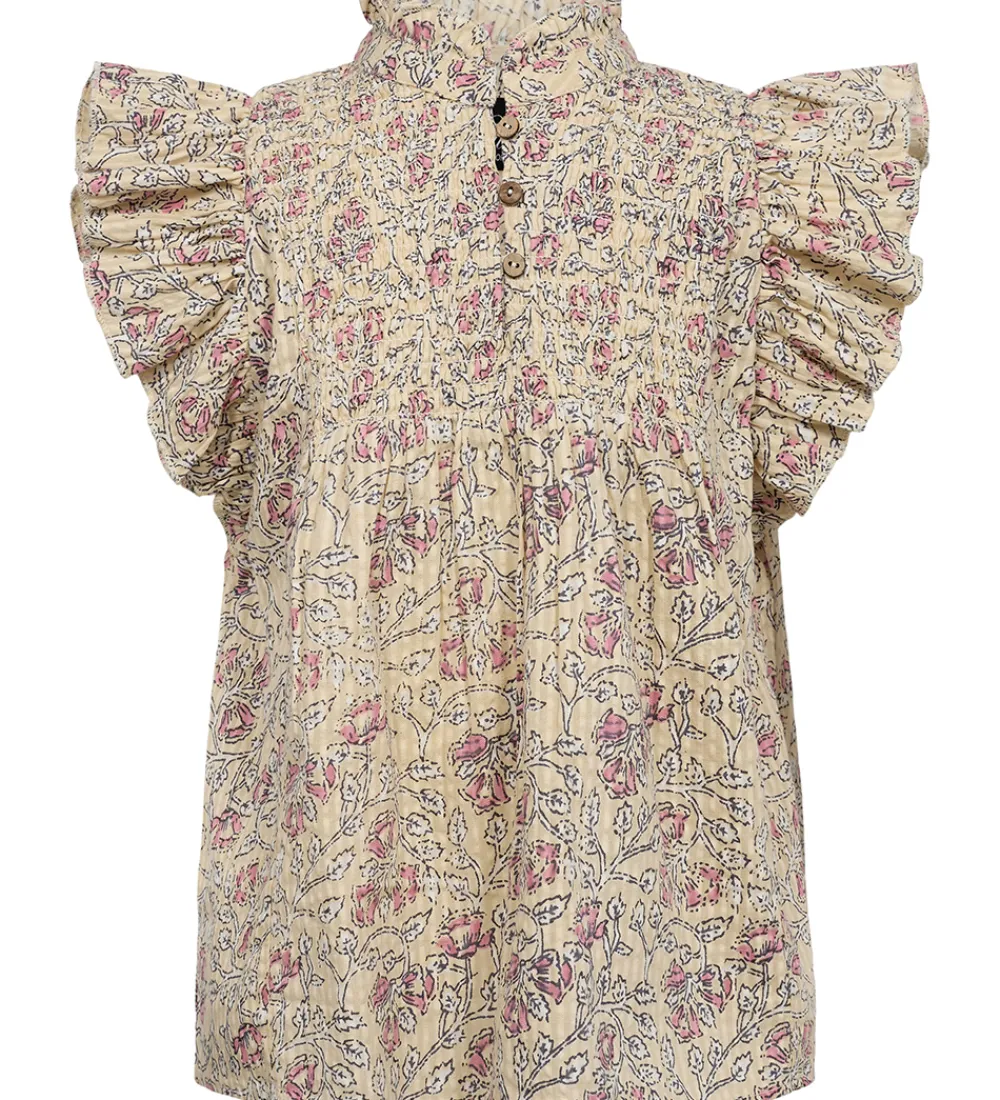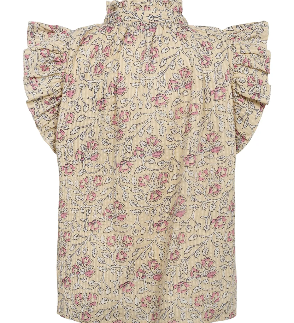 Sofie Schnoor toppen har flotte flæseærmer, og en høj hals med en smal flæsekant. Den kan åbnes under halsen med træknapper på brystet, og i taljen er der en smal sygning. Toppen har en god vidde nederst som giver den flotte folder.