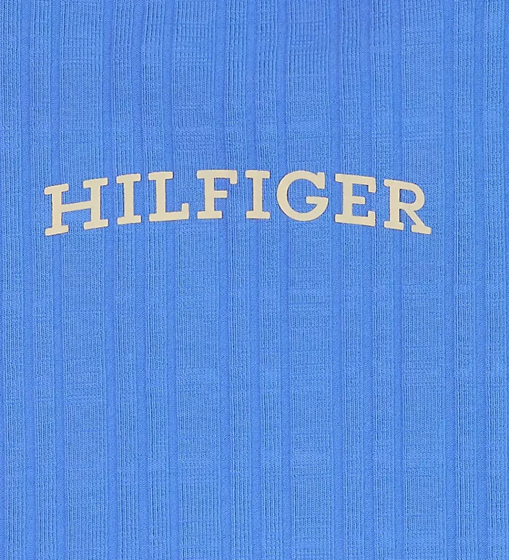 Smart Tommy Hilfiger top i blå med ribstruktur, og fortil står der “Hilfiger” trykt med hvide gummibogstaver.