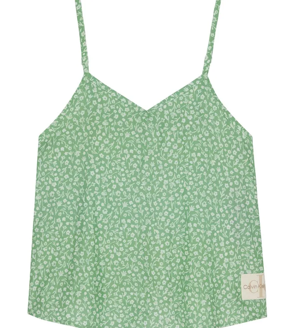 Yndig Calvin Klein top i grøn, med print af hvide blomster over det hele. I venstre side af bunden er der en hvid patch, med brune kanter, mærkets navn i brun og et “cK” logo i beige.