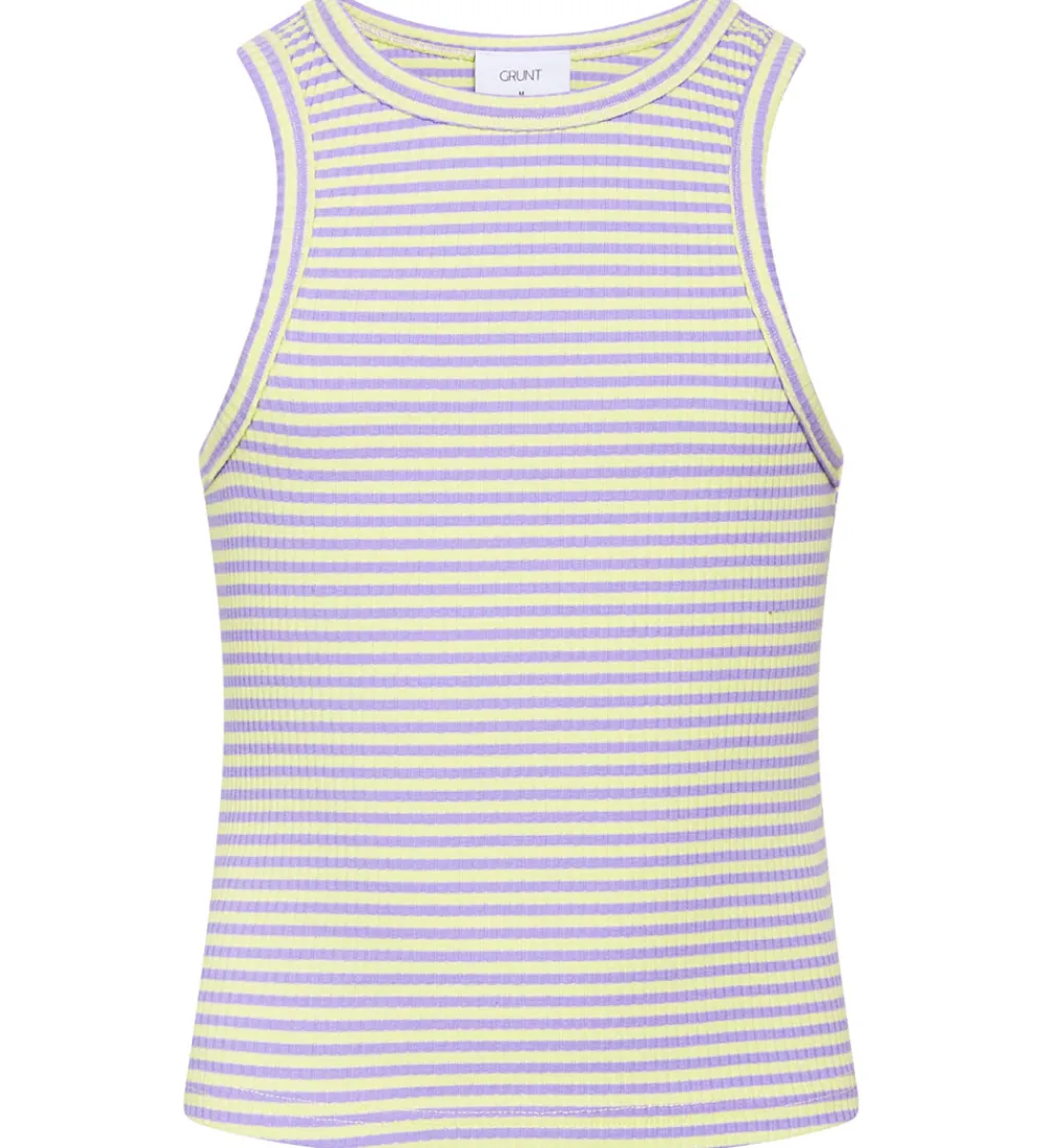 Smuk Grunt top med vandrette striber i lilla og lys gul, samt med en flot ribstruktur.