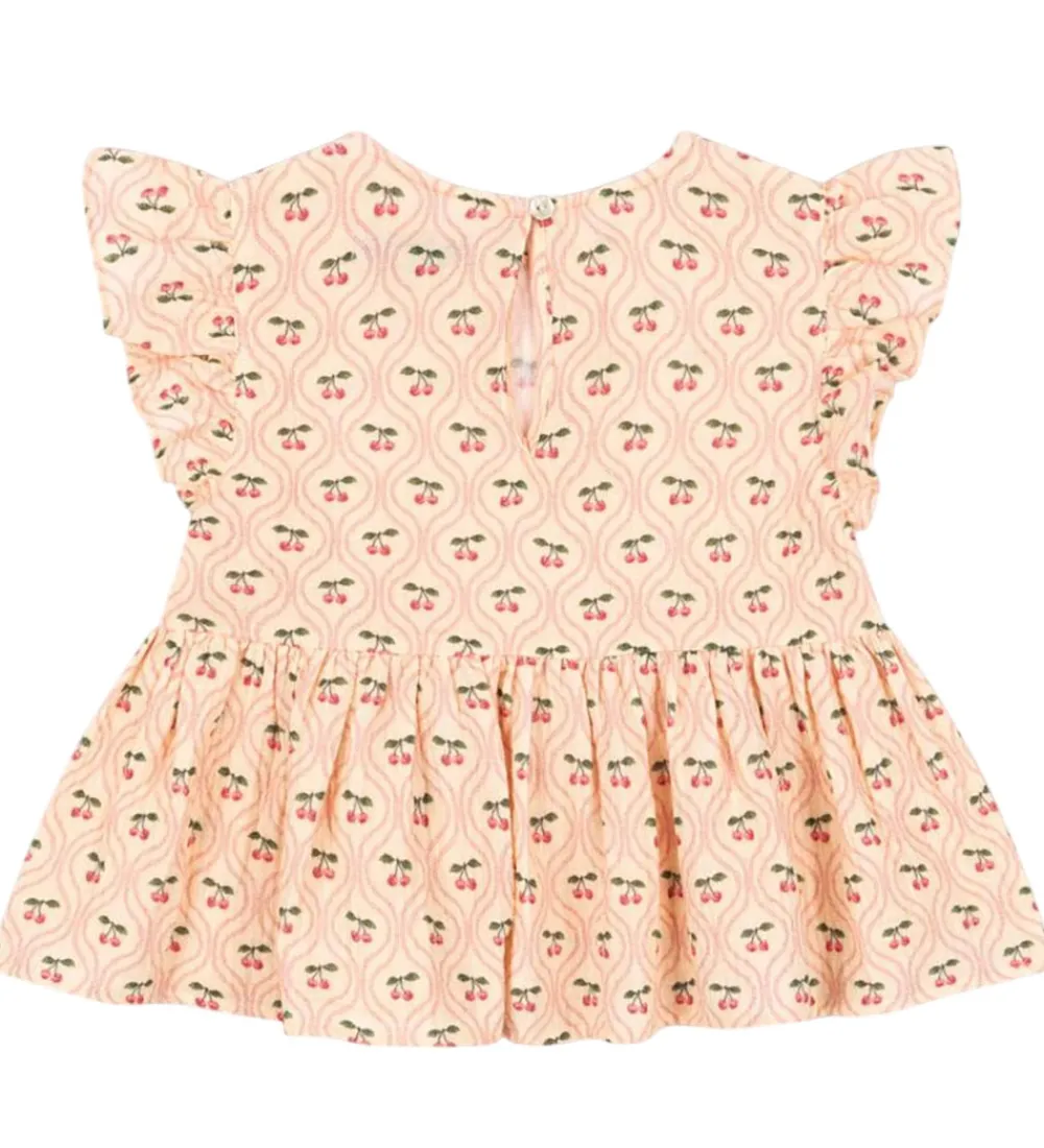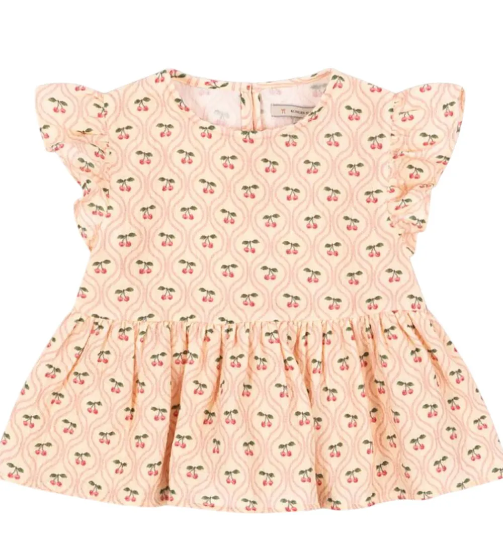 Charmerende Konges Sløjd top i cremehvid med musselin-struktur. Toppen er dekoreret med et fint alloverprint af små kirsebær, hvilket giver et sødt og indbydende udtryk. Konges Sløjd toppen har en rund halsudskæring og korte flæseærmer.
