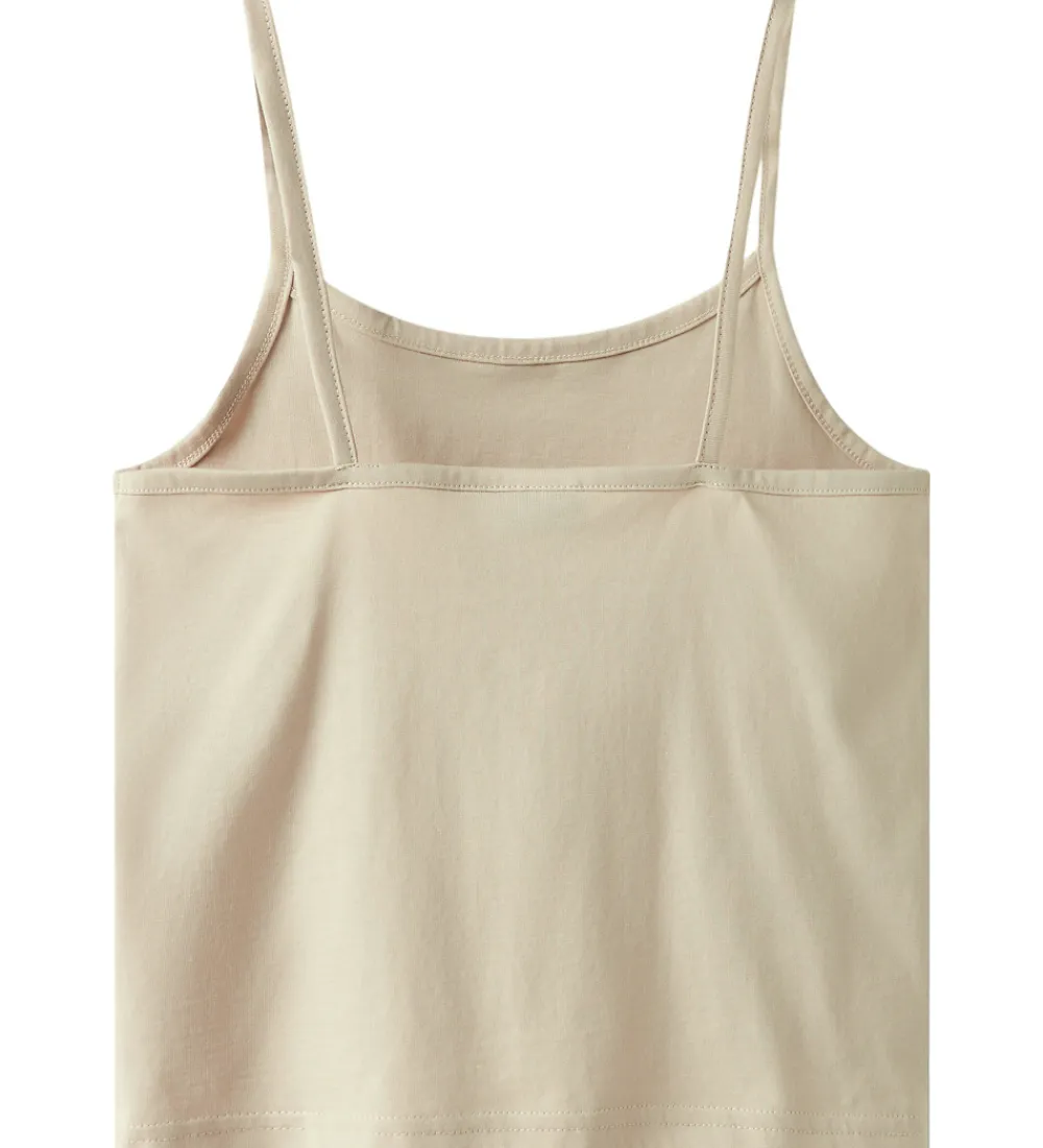 Elegant LMTD top i en neutral, beige farve. Toppen har tynde stropper og en diskret, rund halsudskæring. LMTD toppen er enkel og stilren uden yderligere mønster eller print, hvilket giver den et alsidigt udtryk.