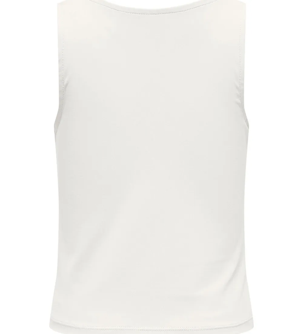 Kids Only toppen er helt uden ærmer og den har brede skulderstropper. På den ene side har den en dyb, kantet udskæring og på den anden side har den en høj udskæring. Toppen har et vendbart design, så man selv kan bestemme om den dybere udskæring skal være fronten eller ryggen.