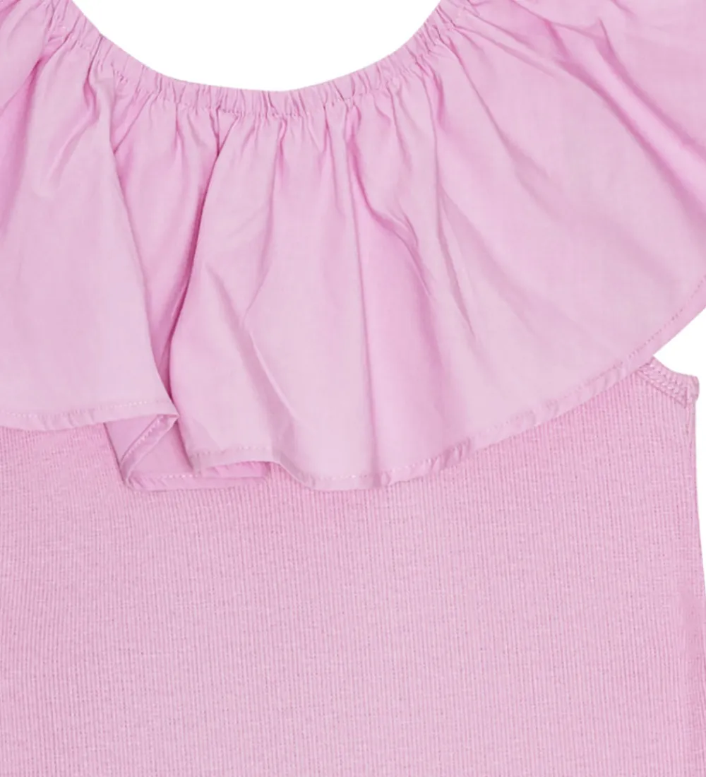 Molo toppen har brede skulderstropper og en rund, elastisk halsudskæring med en dekorativ, bred flæsekant hele vejen rundt, som dækker skuldrene. Toppen er i en blød og strækbar bomuldskvalitet.