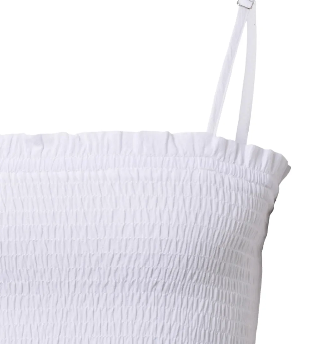 Hound toppen består af en bred smock syning med en flot, bred flæsekant nederst. Toppen er uden ærmer, og den har smalle, justerbare skulderstropper.
