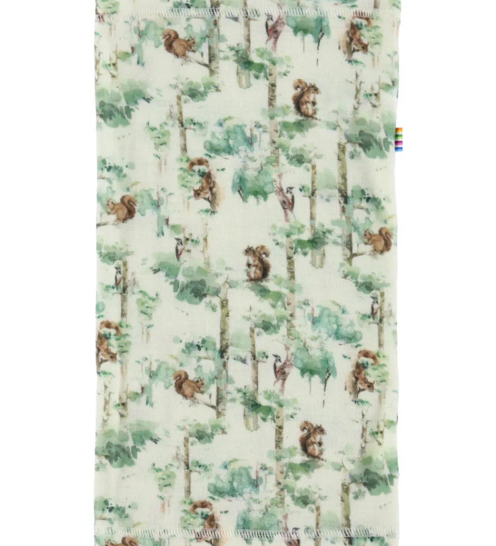 Charmerende Joha tube i cremehvid med et skønt, naturinspireret mønster i grønne og brune nuancer. Designet fremviser fine illustrationer af træer og egern, der skaber en livlig og eventyrlig stemning. Joha tuben har en blød og strækbar kvalitet, som smyger sig behageligt om halsen.