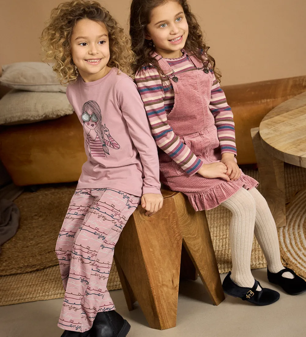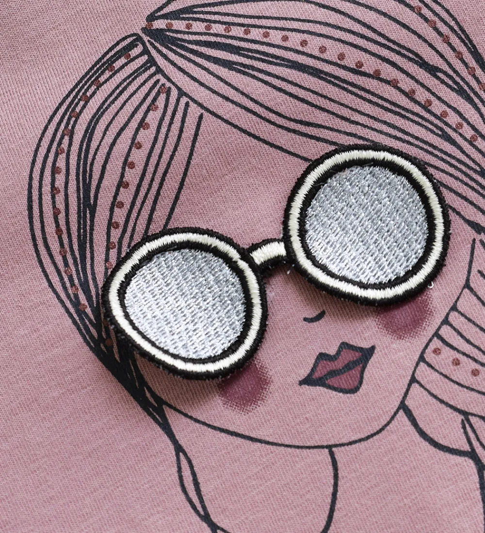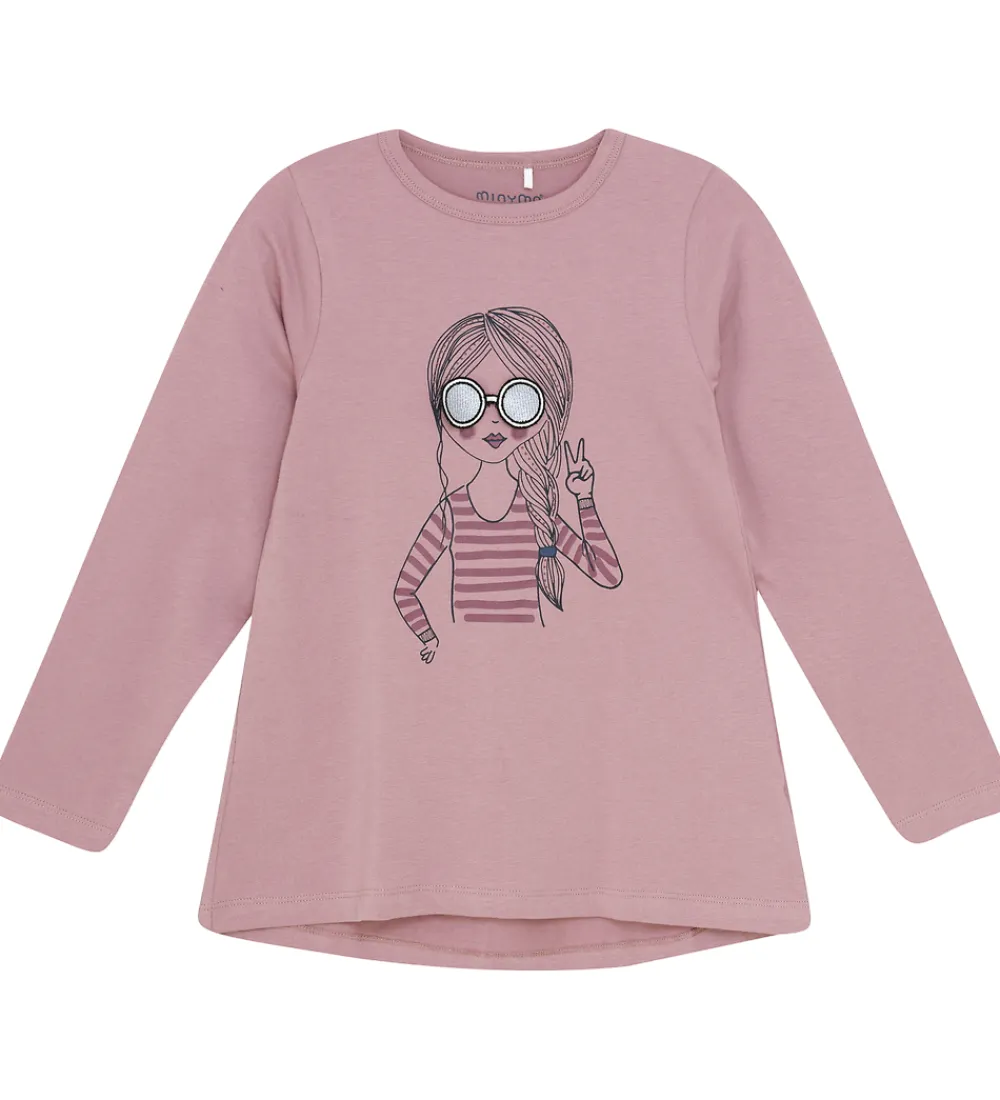 Charmerende Minymo tunika i rosa med et sjovt print på fronten af en pige med solbriller på, som kan vippes op. Minymo tunikaen har en rund halsudskæring med trykknapper ved venstre skulder og lange ærmer. Bagpå er der læg, som giver ekstra vidde.