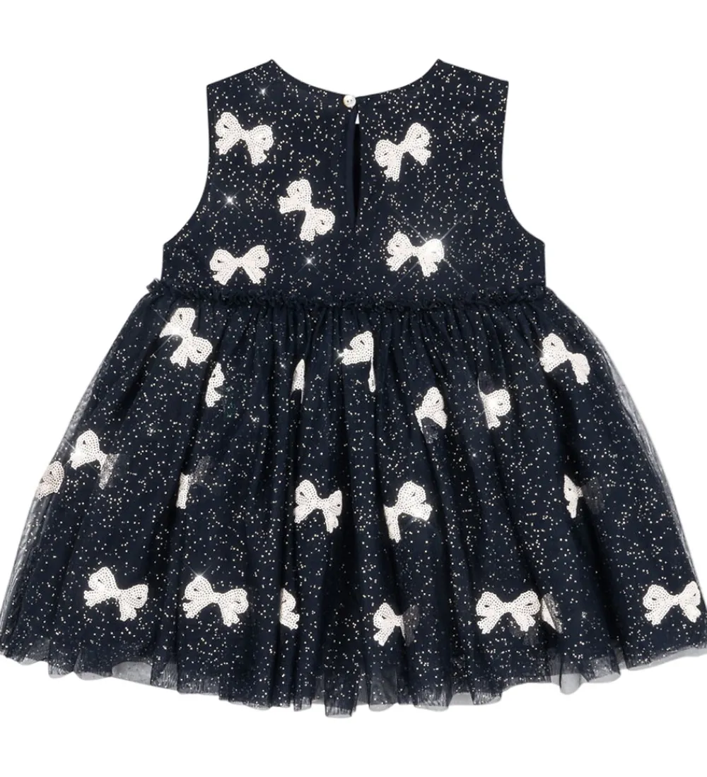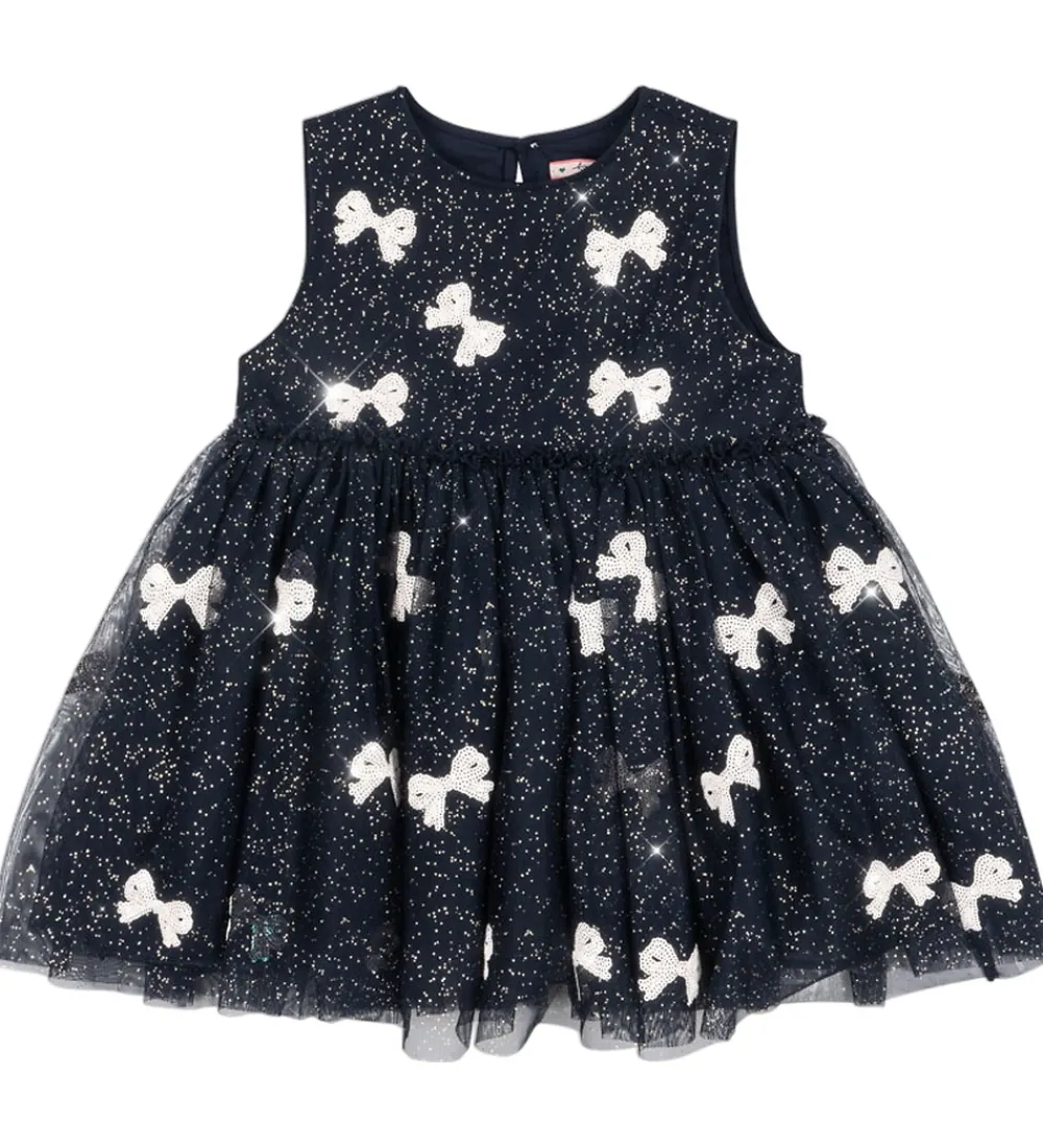 Elegant Konges Sløjd kjole i navy med guldglimmer og pudderrosa sløjfer lavet af pailletter. Tylkjolen er helt uden ærmer, og den har et skørt med masser af viddet. Konges Sløjd kjolen lukkes i nakken med en knap, og den har bomuld på indersiden.