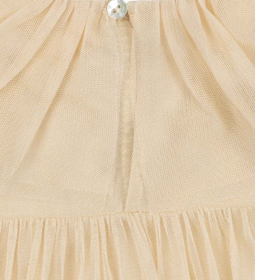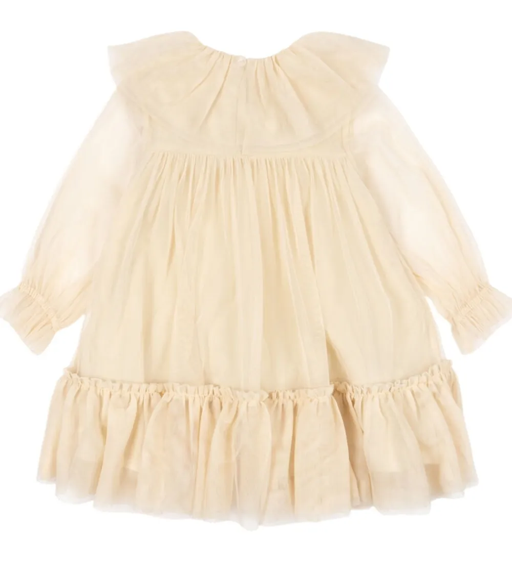 Fin Konges Sløjd tylkjole i creme, og i halsåbningen sidder der en stor sløjfe i sort velour. Kjolen har lange ærmer med smalle elastikkanter og flæseafslutninger, og hele vejen rundt i halsåbningen er der en stor flæse af to lag tyl. Kjolen har masser af vidde, og på indersiden er der et ekstra lag af fastvævet bomuld.
