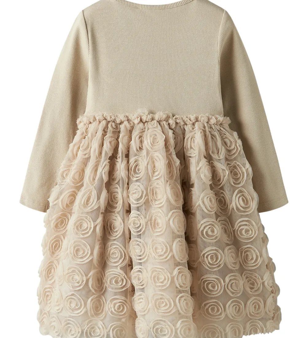 Fin Name It kjole i ensfarvet lys beige. Name It kjolen har lange ærmer, og toppen er lavet af blødt bomuld med rbstruktur. Nedenunder falder tylskørtet med masser af vidde, og det er dekoereret med massvis af roser lavet af tyl.