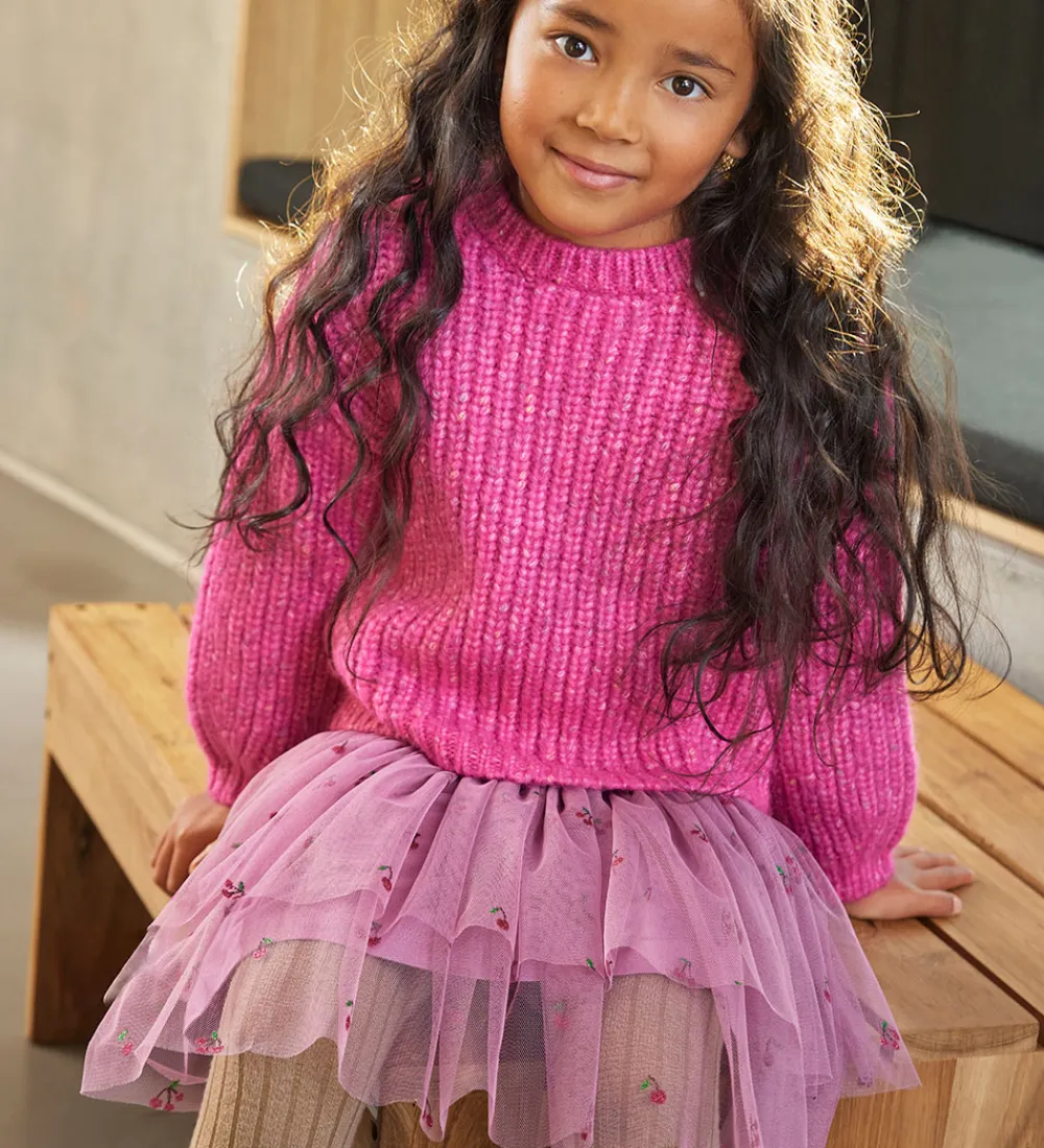 Elegant Minymo tylnederdel i rosa med et fint kirsebærprint med glimmer. I livet har den en bred elastikkant med glimmer. Minymo nederdelen består af to lag med to lag tyl yderst og et lag i kraftigt bomuldsjersey på indersiden.
