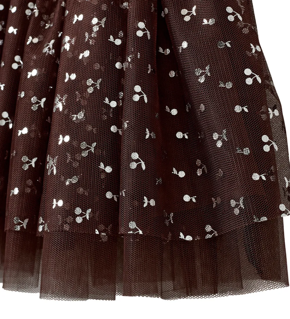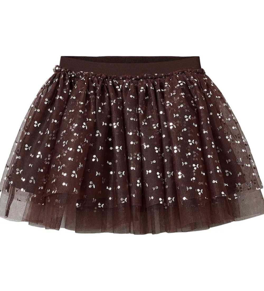 Elegant Sofie Schnoor tylnederdel i en dyb, rødbrun nuance med delikat kirsebærprint. Sofie Schnoor nederdelen har en luftig struktur med lagdelt tyl og en elastisk talje, der sikrer en smidig pasform.