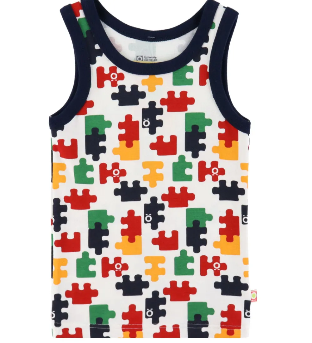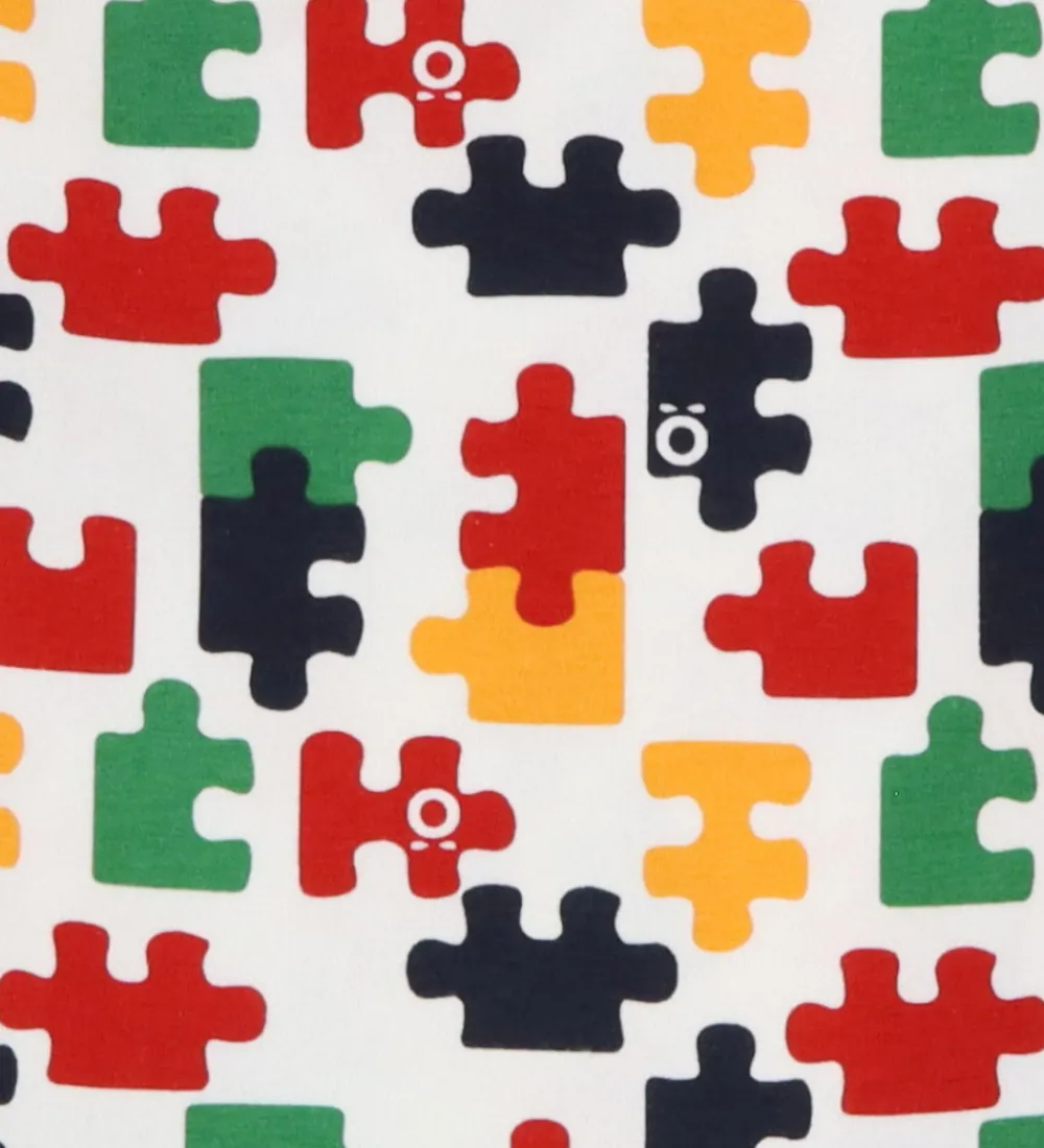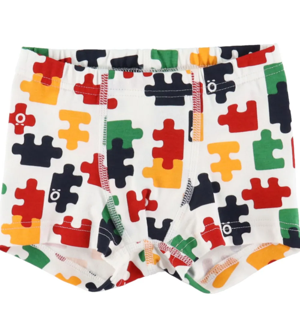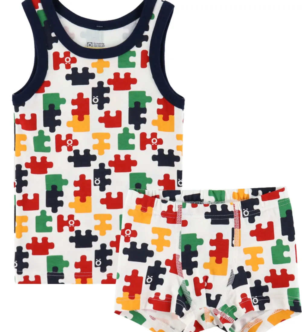 Farverigt Katvig undertøj bestående af en understrøje og et par boxershorts i hvid med print af puslespilsbrikker i forskellige farver.