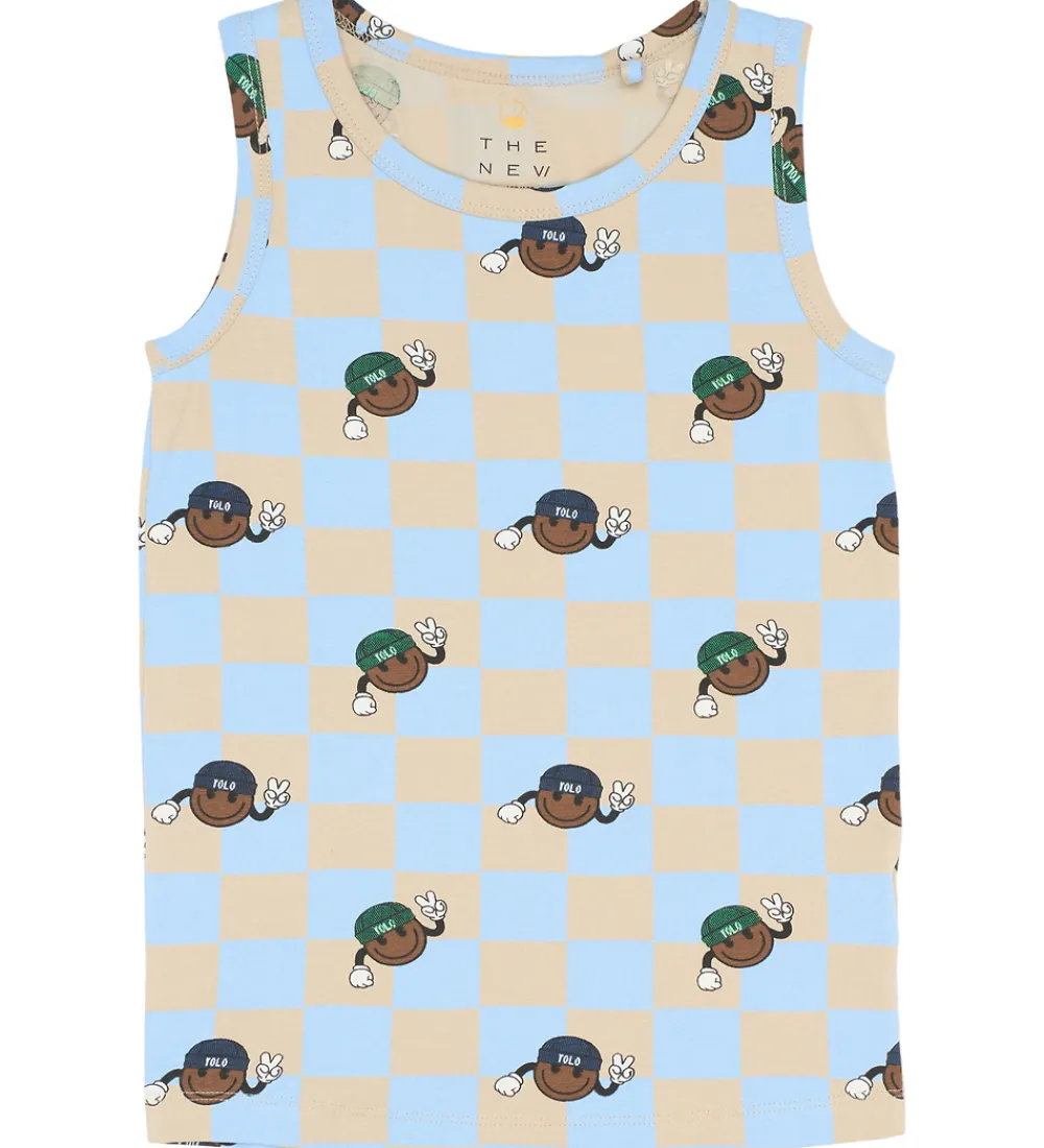 - Skakternet i beige og blå og med et alloverprint af en cool smiley-figur.