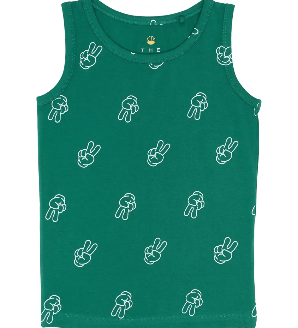 - Grøn med et alloverprint af håndtegn i en hvid, tegnet stil.